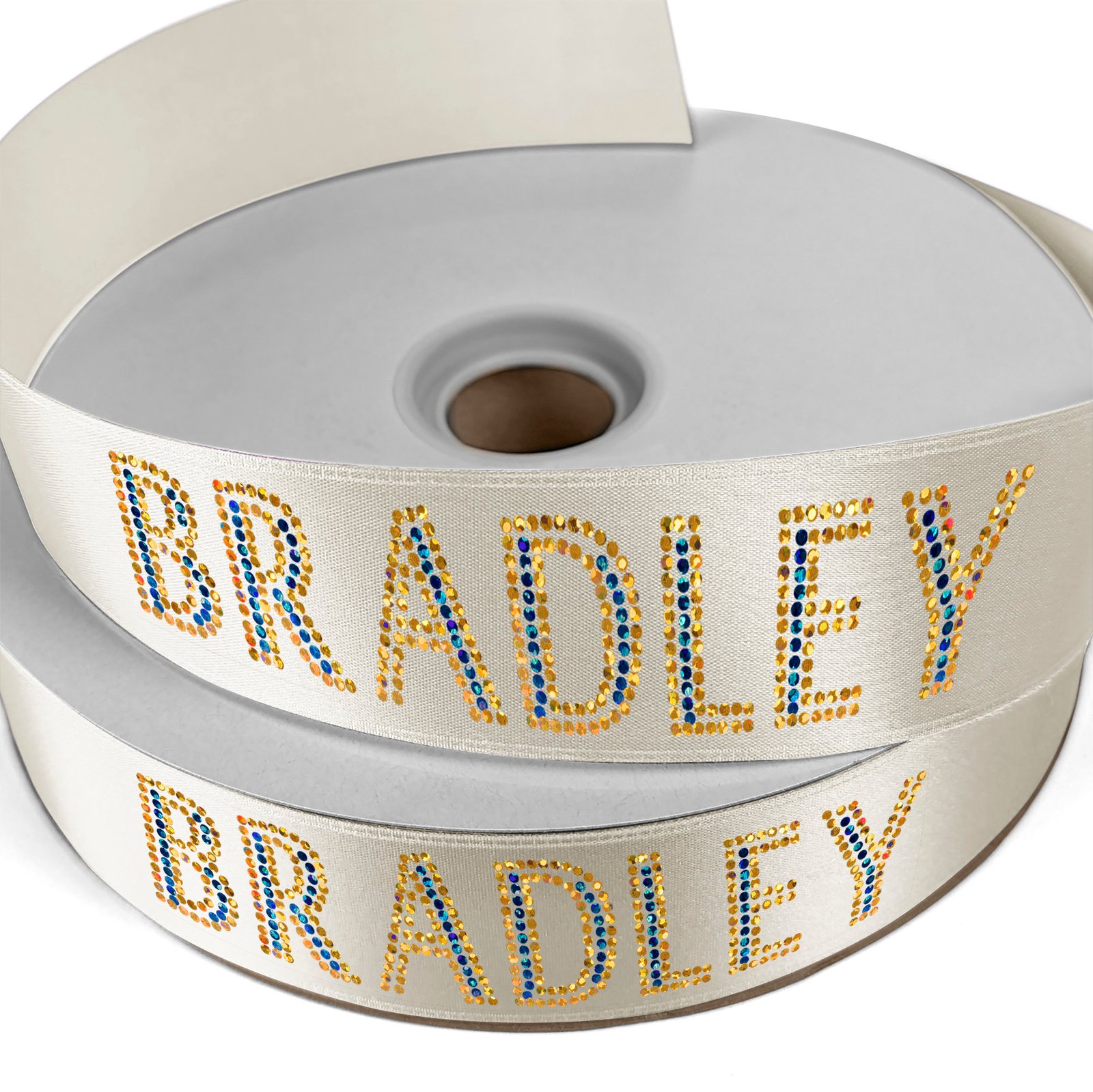 Thick Badge Satin Ribbon holds its shape beautifully and makes any occasional special. Personalize ribbon with your text or logo. Or, ask for your custom-printed ribbon to be assembled into bows with an adhesive peel-and-stick back. 50 Yard Roll. 50 yd L x 1 1/2″ H
