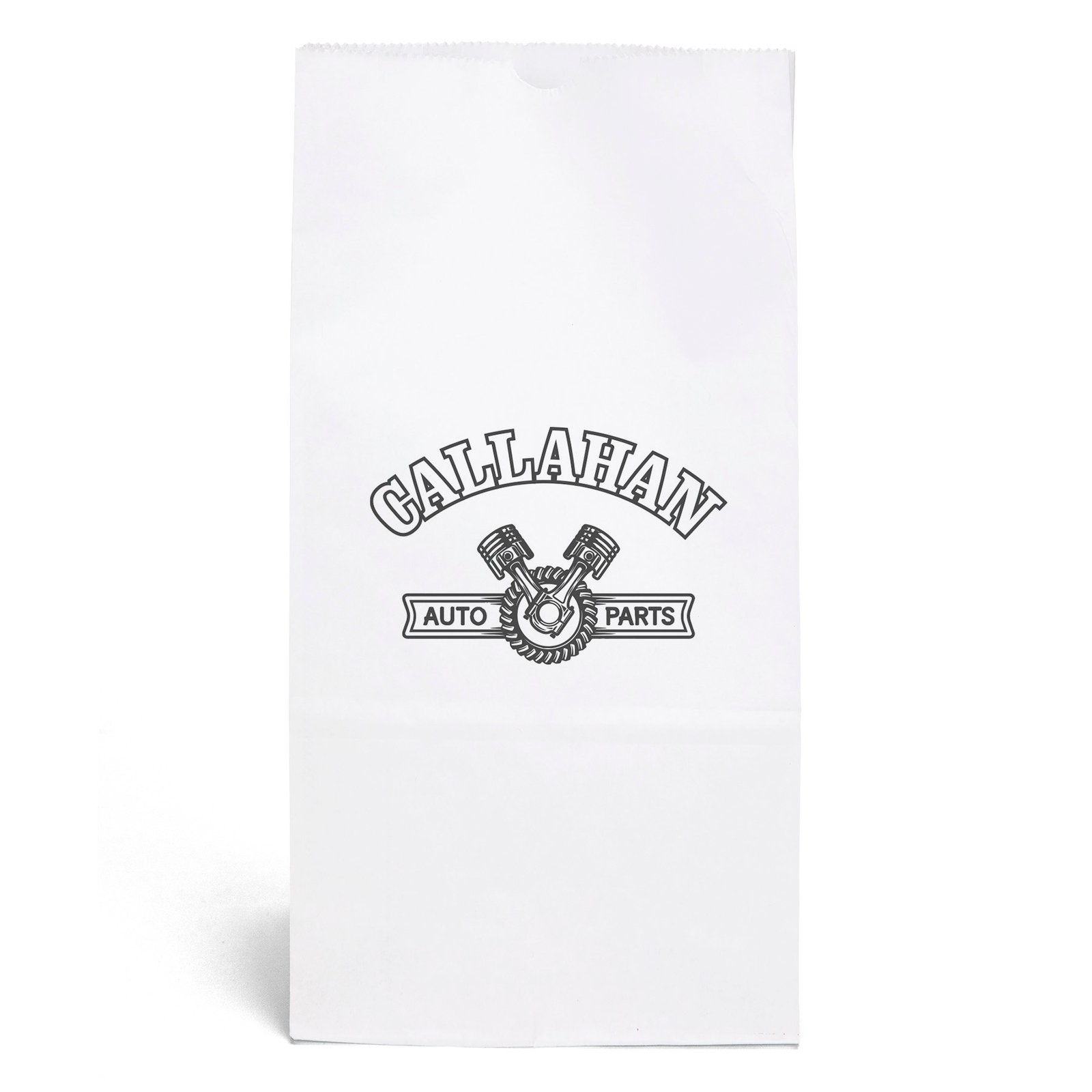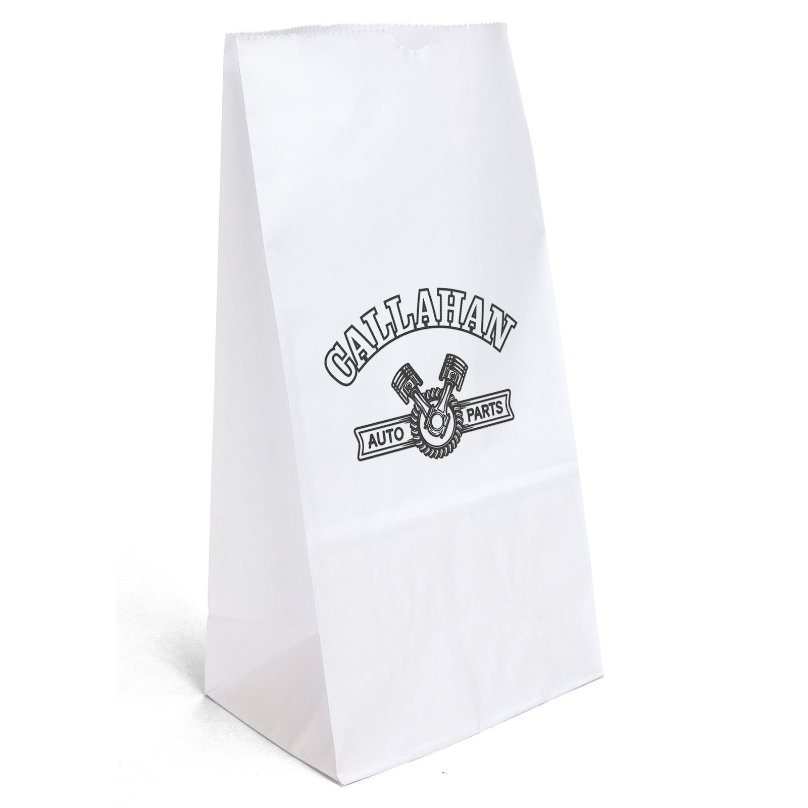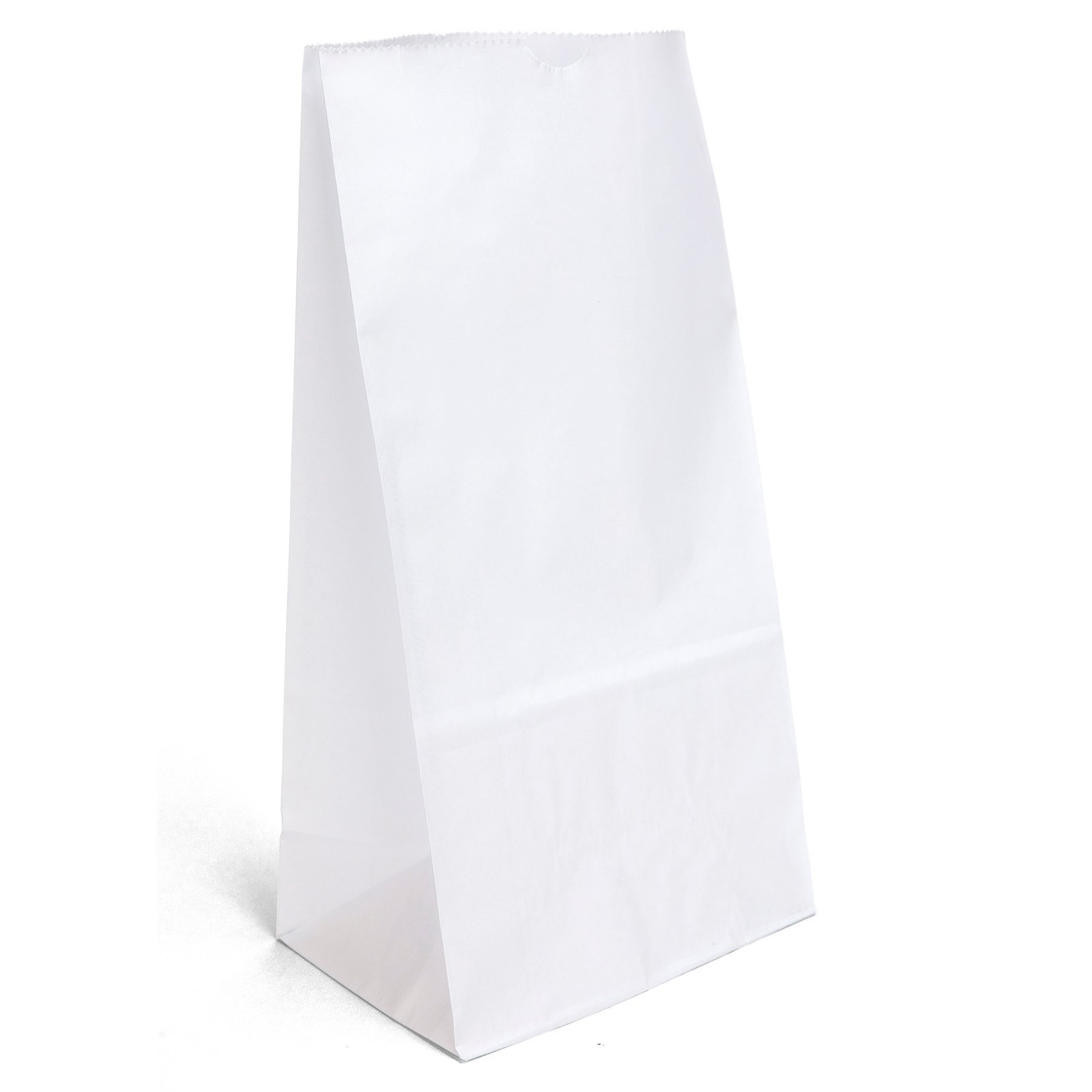 Durable white paper S.O.S. Bag features a side gusset and a serrated cut top. 7 1/8″ W x 4 3/8″ D x 13 7/8″ H