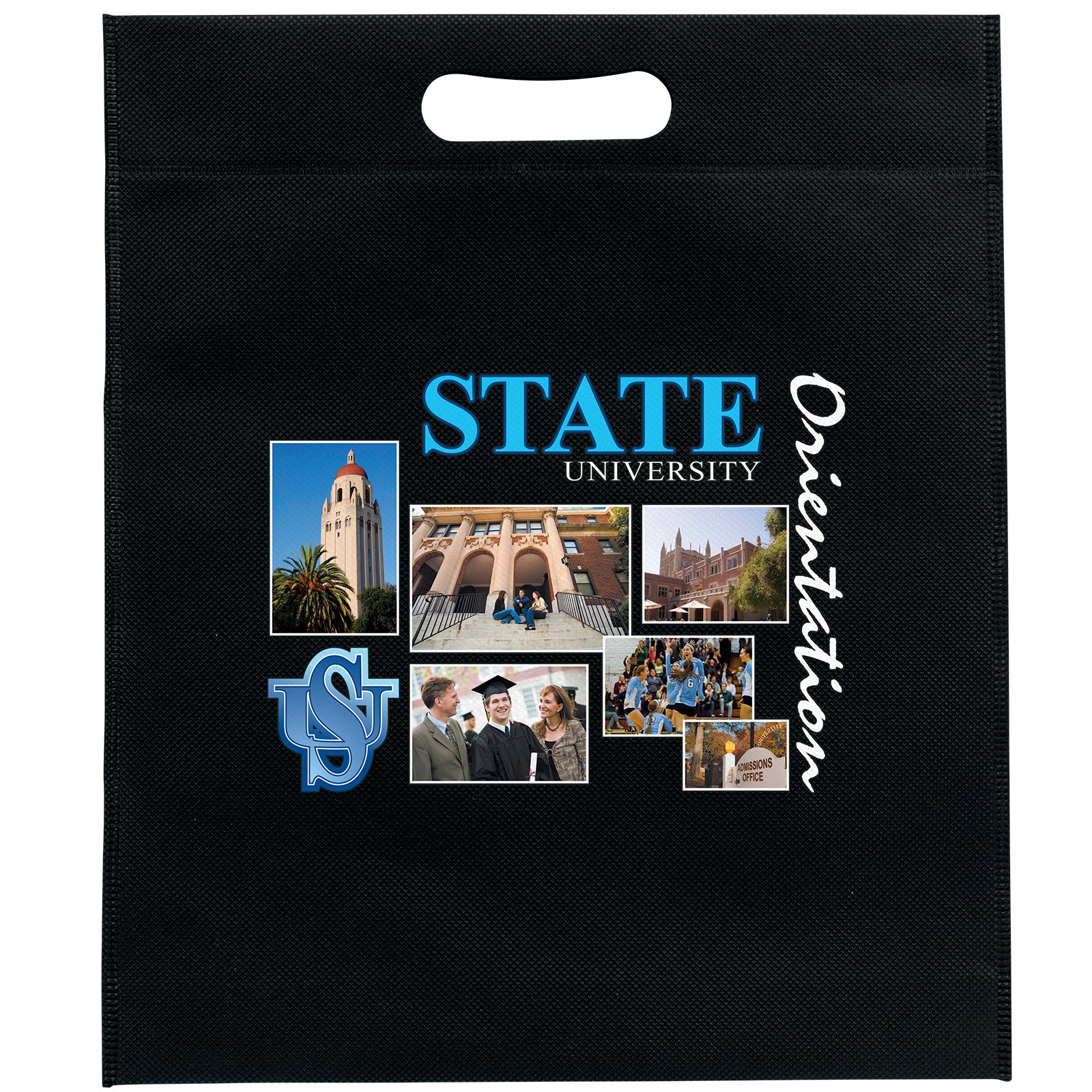 This 13W x 15H x 3 reusable bag is made with premium non-woven material and die cut handles. 13″ W x 15″ H x 3″ D