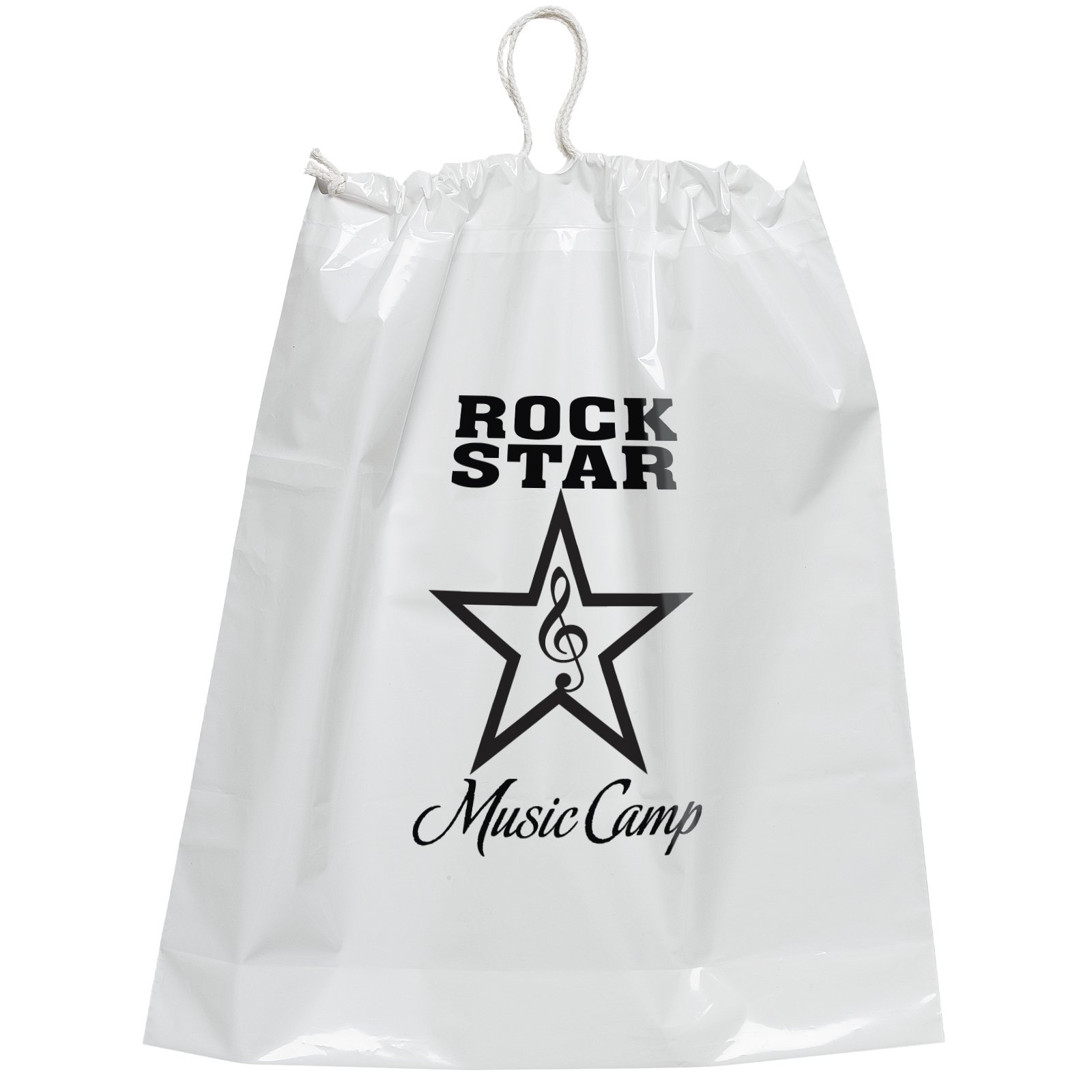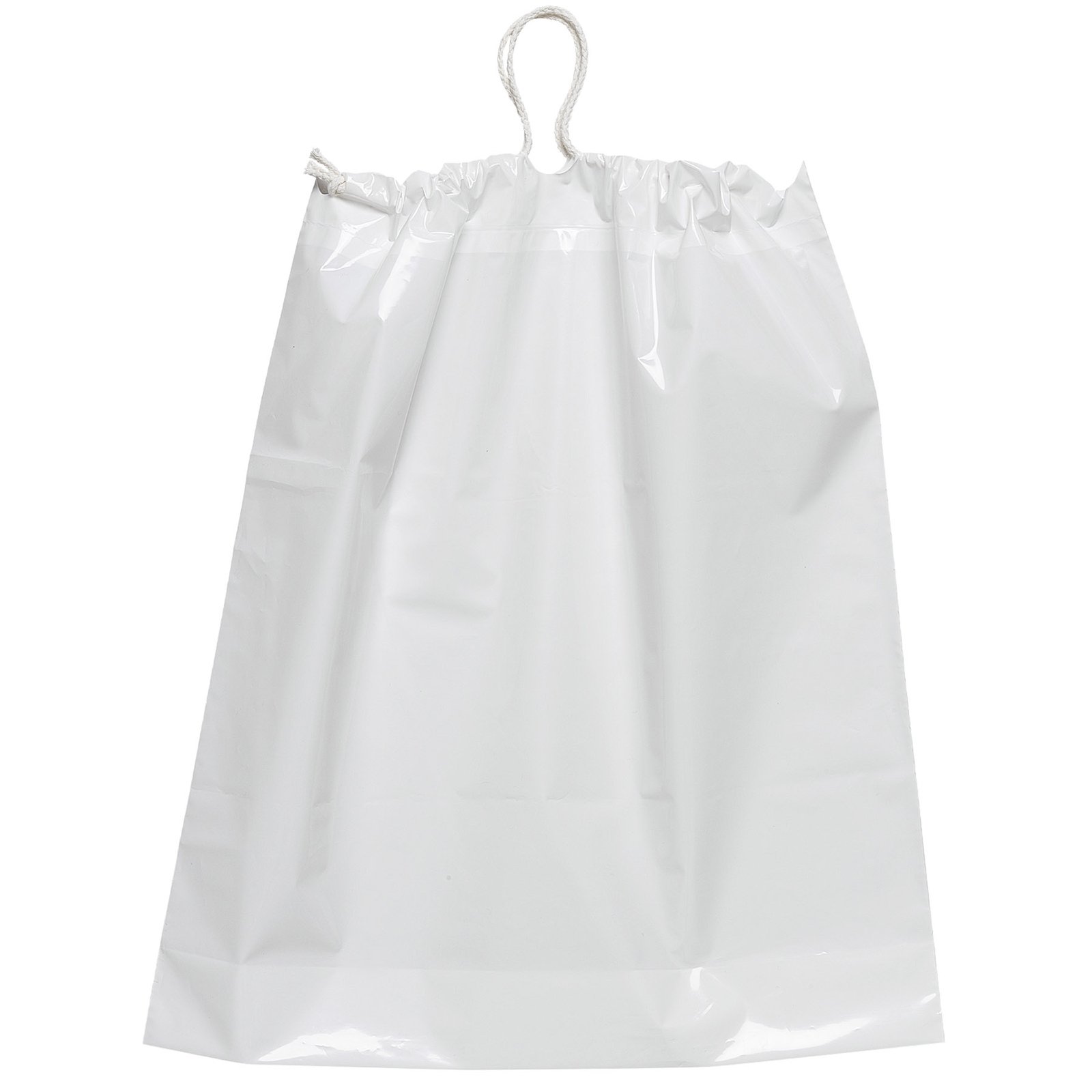 This lo-density 2.5 mil plastic bag features a cotton-draw handle to cinch the top closed and a bottom gusset. 16″ W x 18″ H x 4″ D