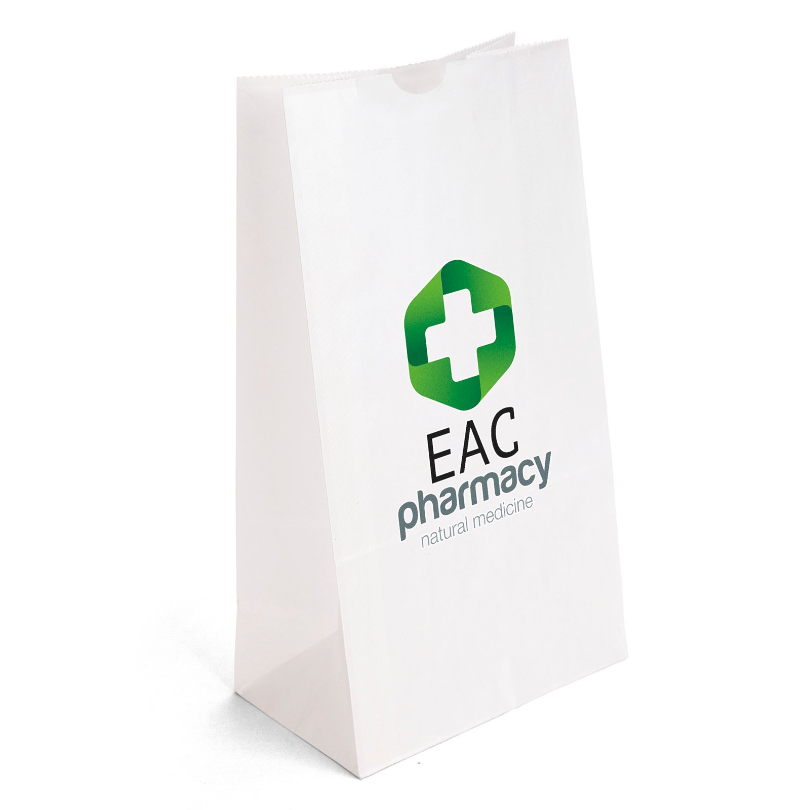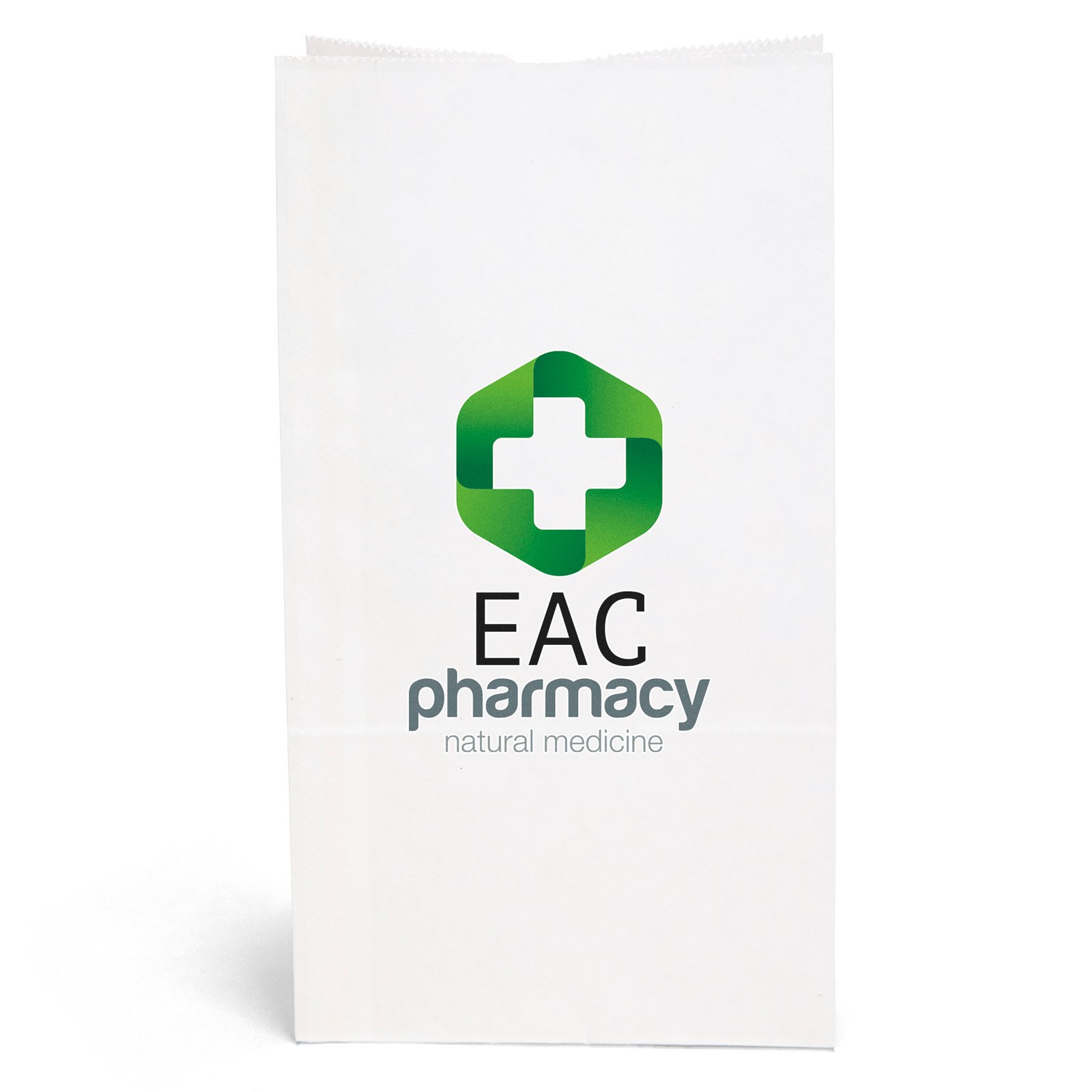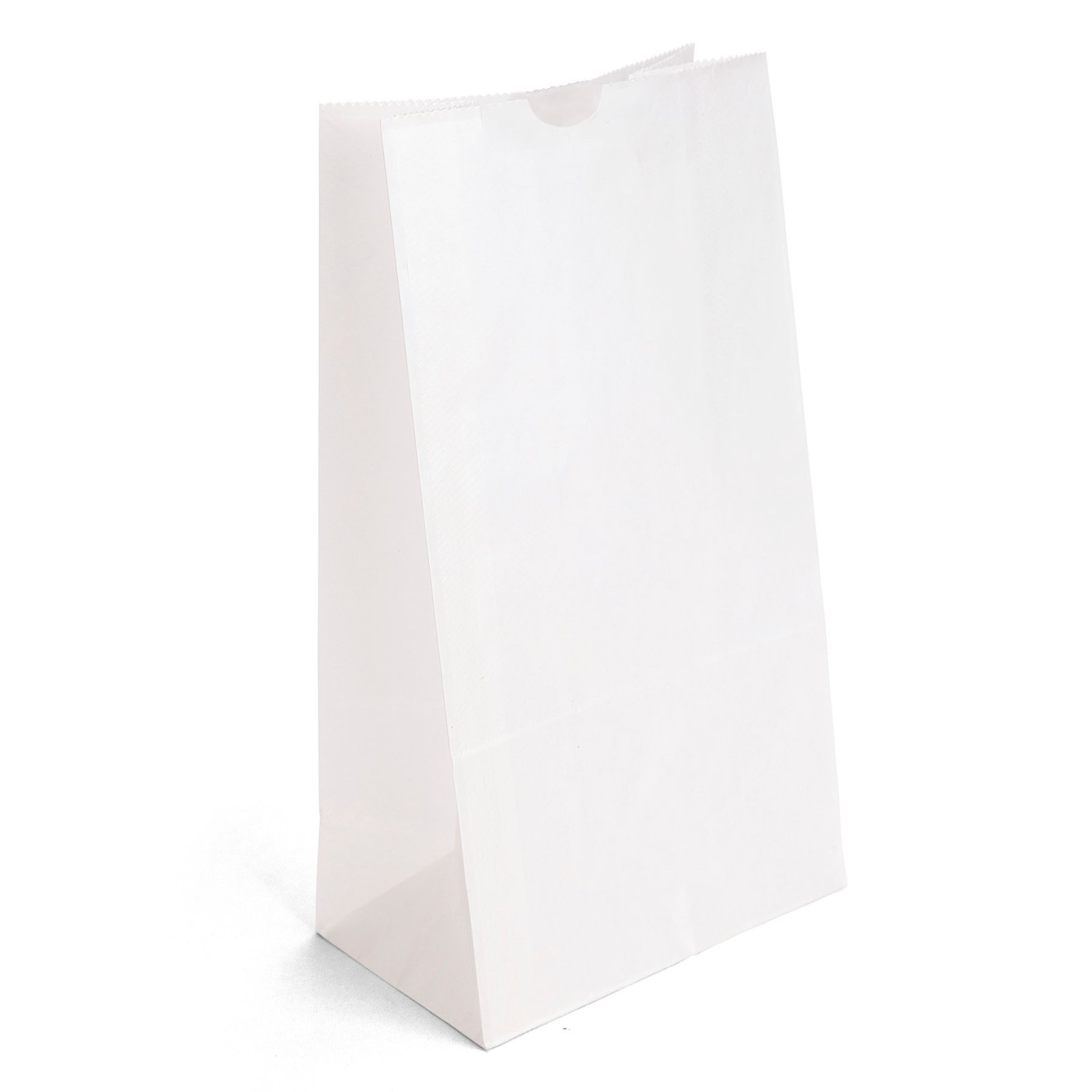 Durable white paper S.O.S. Bag features a side gusset and a serrated cut top. 6″ W x 3 5/8″ D x 11″ H