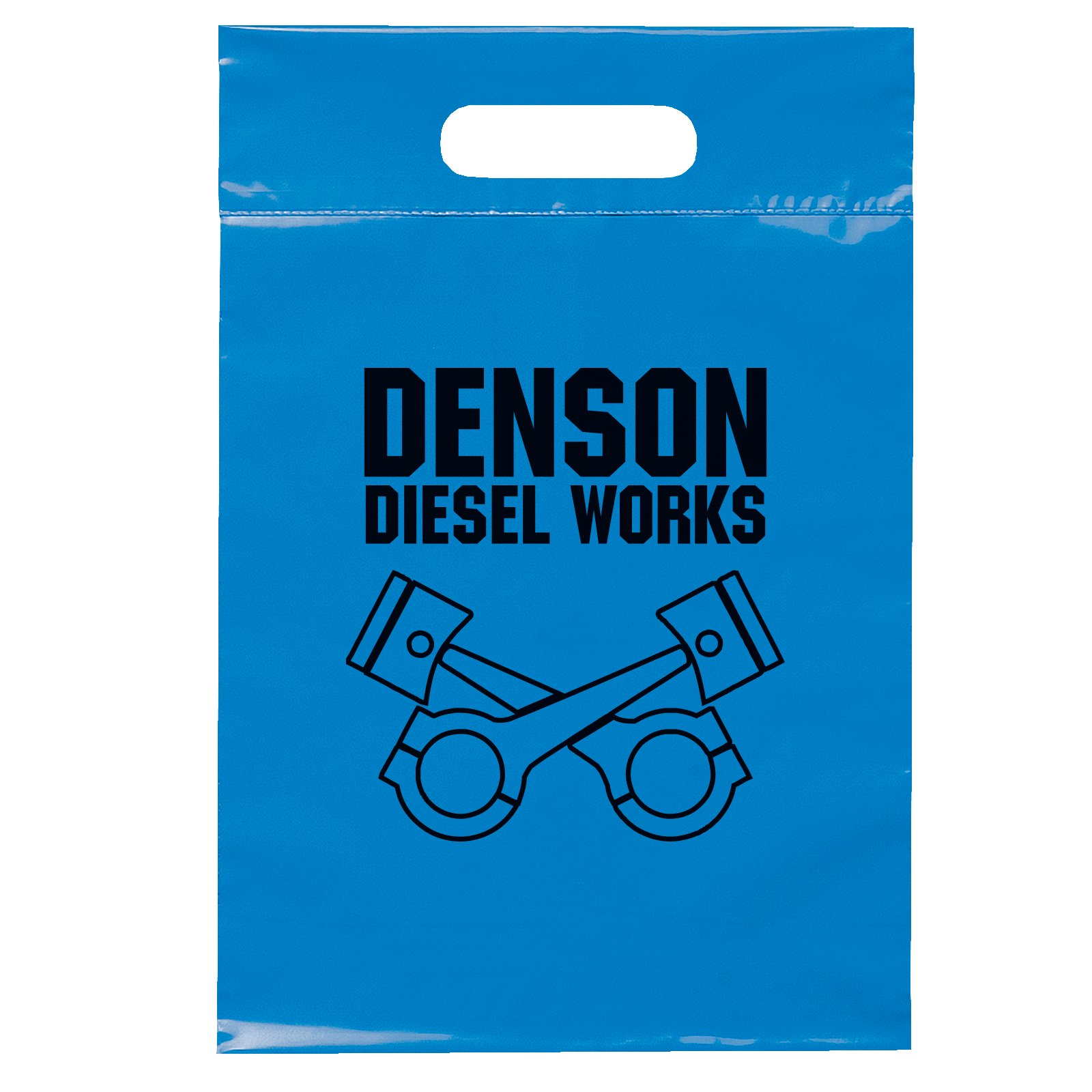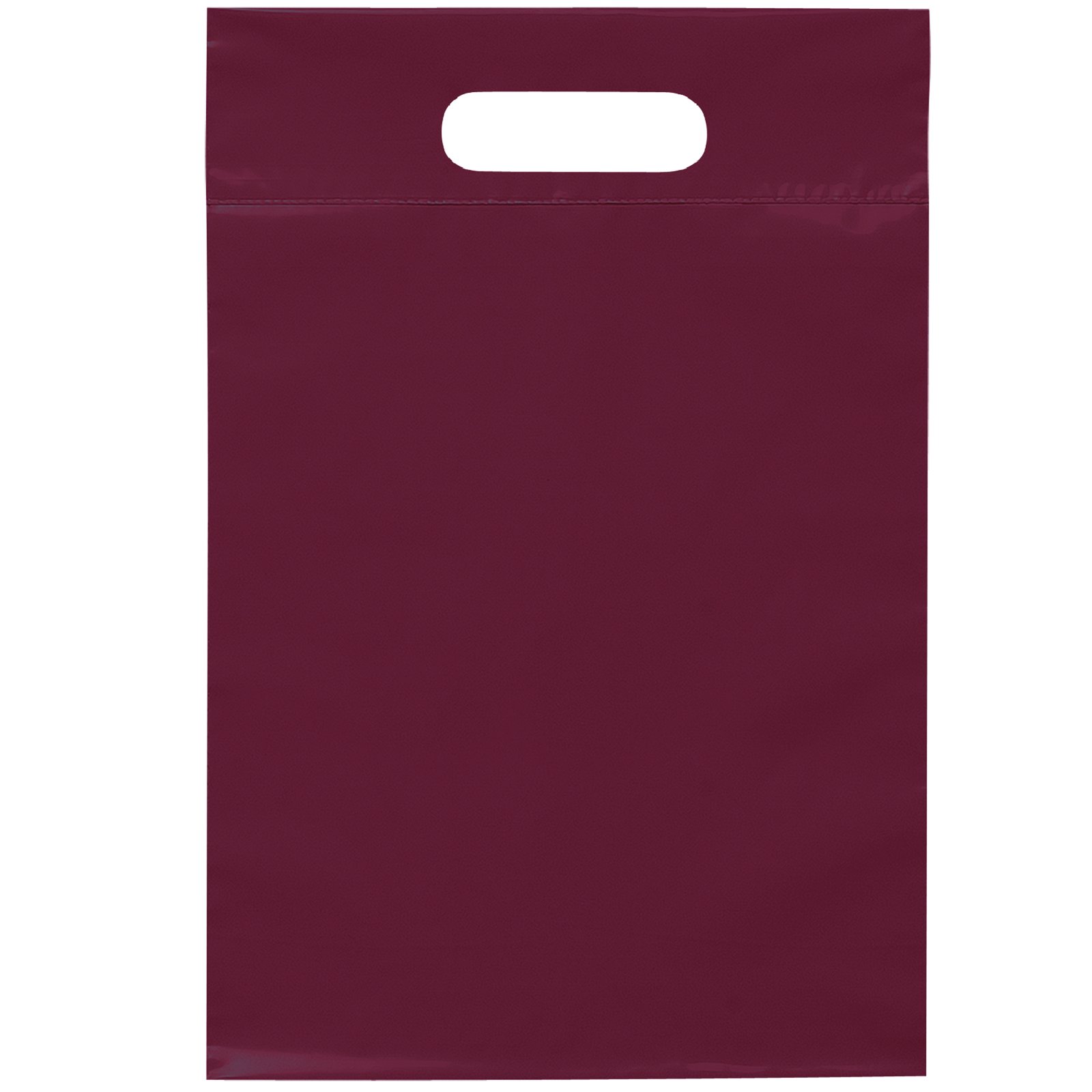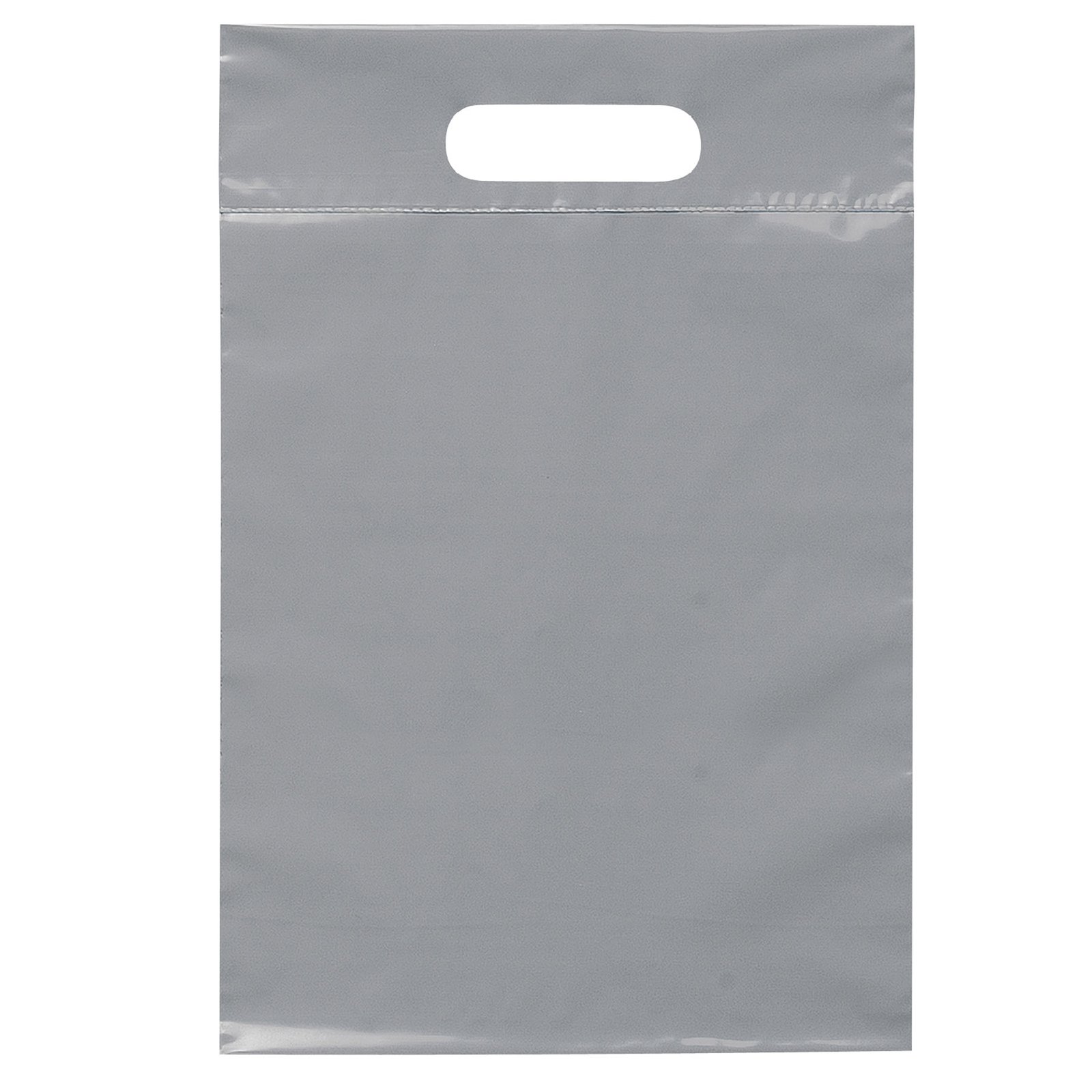This 2.5 mil lo-density plastic bag features fold-over reinforced die cut handles. 9 1/2″ W x 14″ H