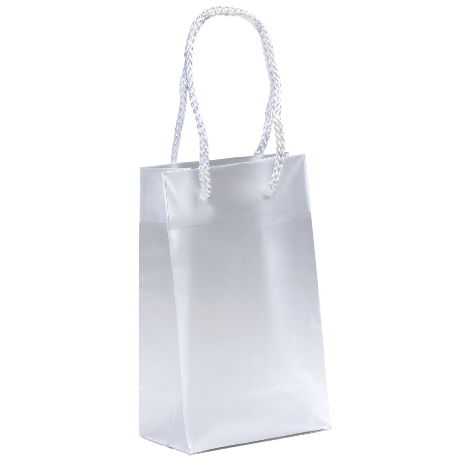 Frosted hi-density plastic bags feature macramé handles, a reinforced fold over top, and a cardboard bottom insert. 5″ W x 3″ D x 8″ H