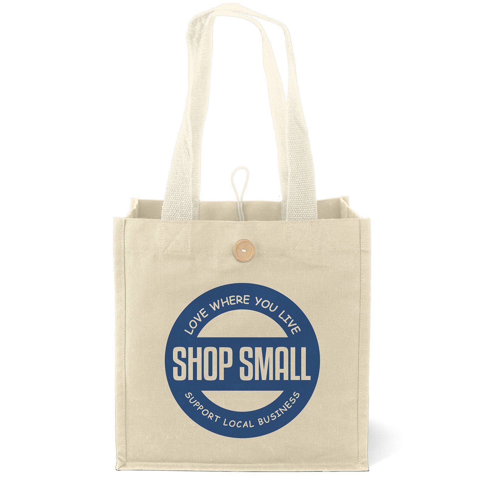 The Aurora™ Cotton Tote is made with durable 10-oz. cotton and features 1 1/2″W x 28″-long cotton twill handles and a wooden button with loop closure. An optional plastic bottom insert is available for purchase. *Due to the natural character of cotton fabric, slight color variances will occur between bags. 13″ W x 8″ D x 13″ H