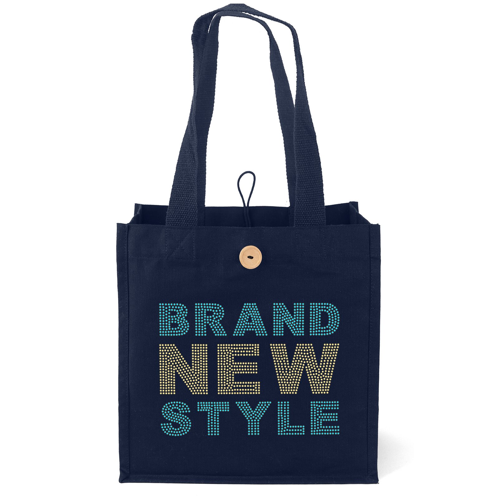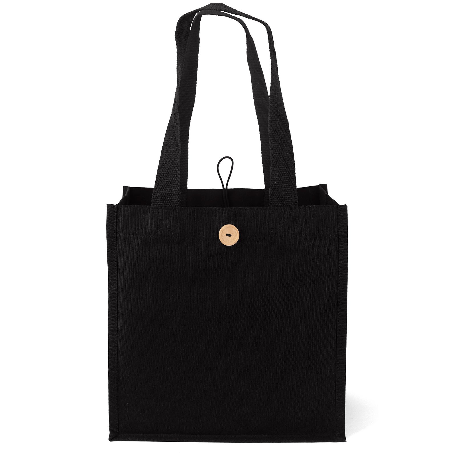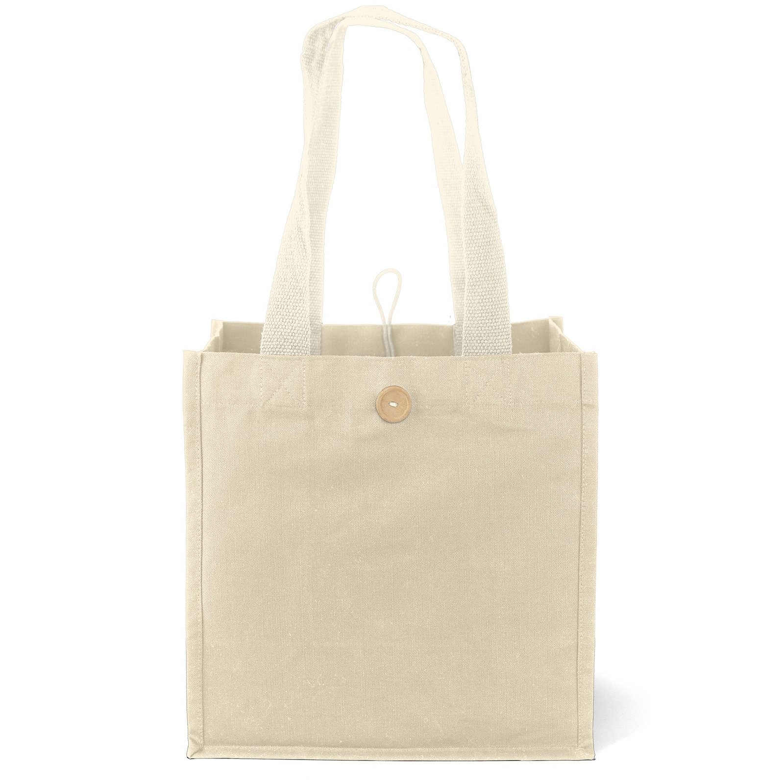 The Aurora™ Cotton Tote is made with durable 10-oz. cotton and features 1 1/2″W x 28″-long cotton twill handles and a wooden button with loop closure. An optional plastic bottom insert is available for purchase. *Due to the natural character of cotton fabric, slight color variances will occur between bags. 13″ W x 8″ D x 13″ H
