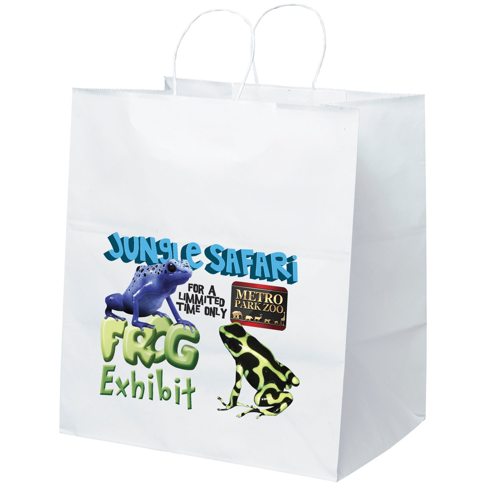 The Brute White Shopper is made with white kraft paper and features twisted paper handles and a serrated cut top. 14″ W x 10″ D x 15 1/2″ H