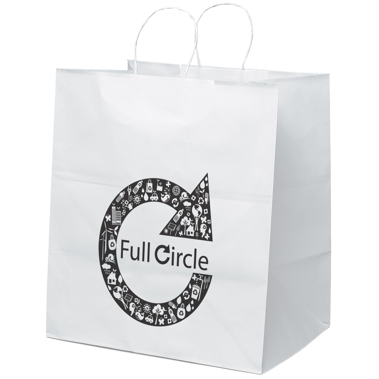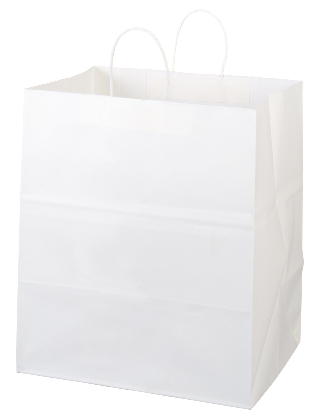 The Brute White Shopper is made with white kraft paper and features twisted paper handles and a serrated cut top. 14″ W x 10″ D x 15 1/2″ H
