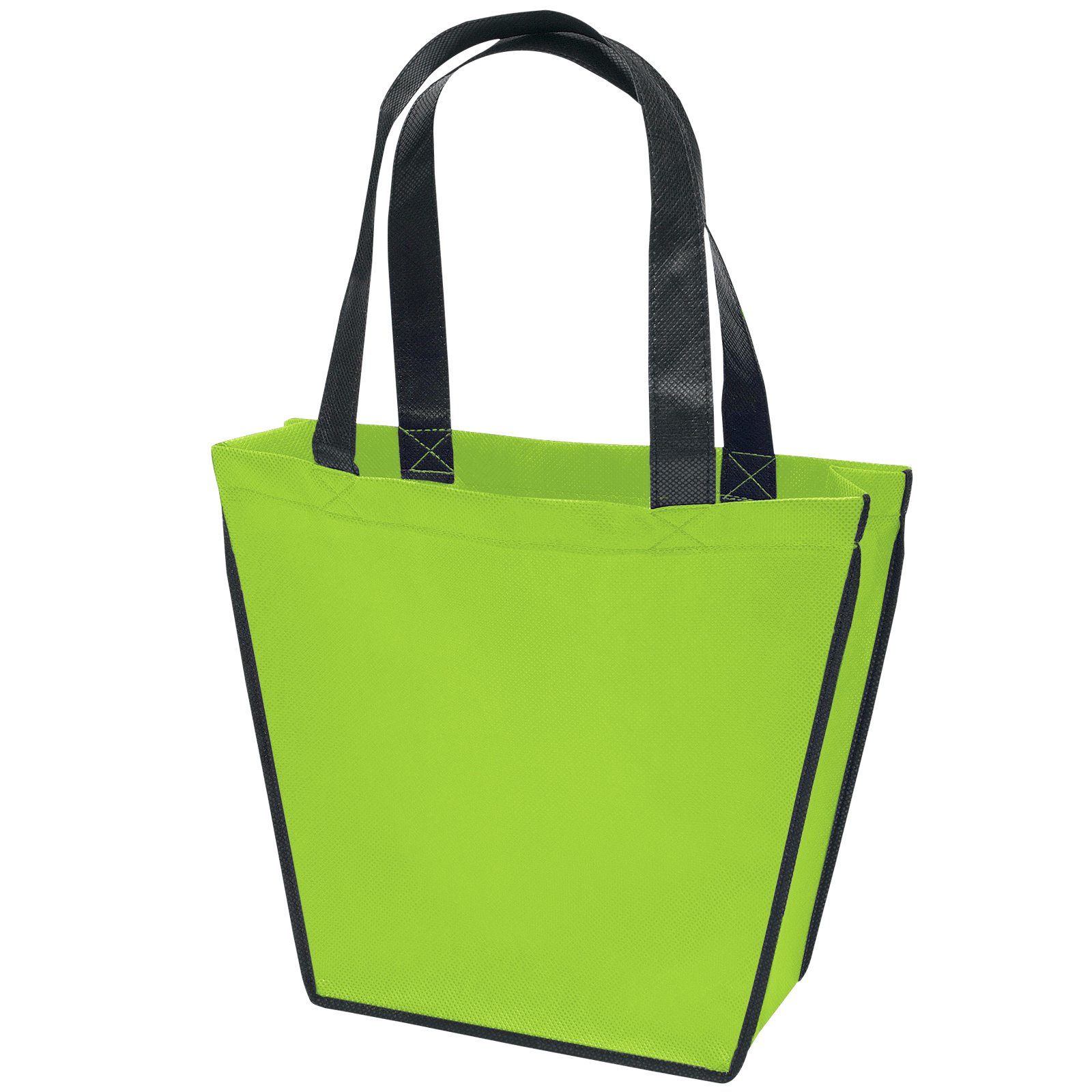 Stand out from the crowd with the Carnival Tote’s unique trapezoid shape. The Carnival Tote is made with 80 GSM premium non-woven material, black handles, black accent piping, and plastic bottom insert. Handles measure 1″W x 18″ long. 12″ W x 4″ D x 10″ H