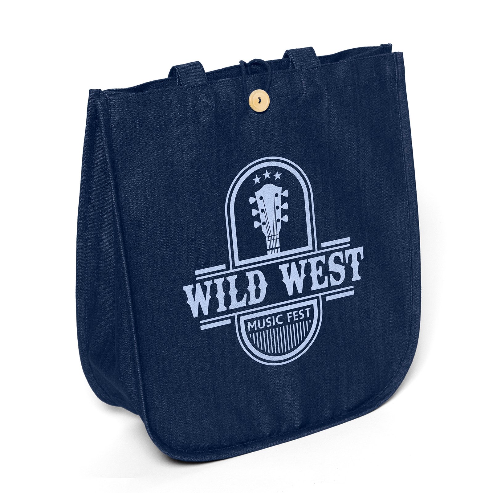 The reusable Dan™ Denim Tote is made of durable 12-oz. cotton with a classic dark-wash denim look. The bag features a stylish curved bottom, a wooden button with loop closure, and 28″ long denim handles. An optional plastic bottom insert is available for purchase. *Due to the natural character of denim fabric, slight color variances will occur between bags. 15″ W x 6″ D x 17″ H
