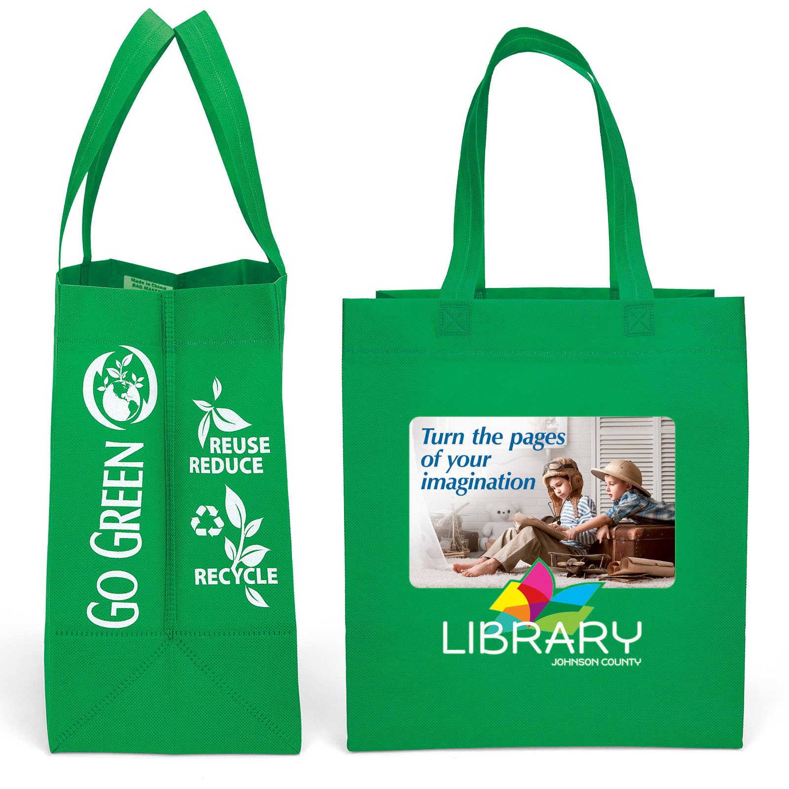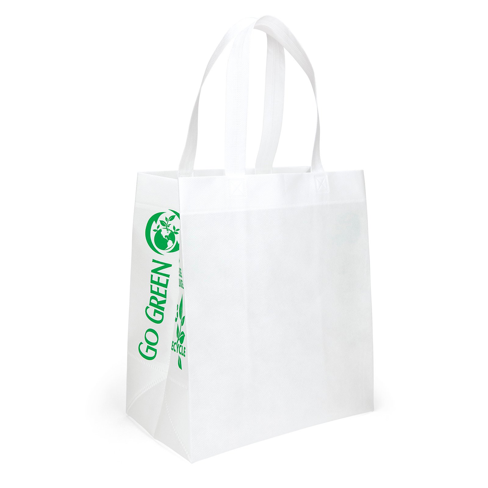 The 80 GSM non-woven Economy Tote offers a larger imprint area than standard grocery bags, along with heat-sealed handles, and fused seams. An optional plastic bottom insert is available for purchase. Stock imprinting on the side gussets includes messaging to promote reuse of the bag. Handles measure 1″W x 20″ long. 13″ W x 8″ D x 15″ W