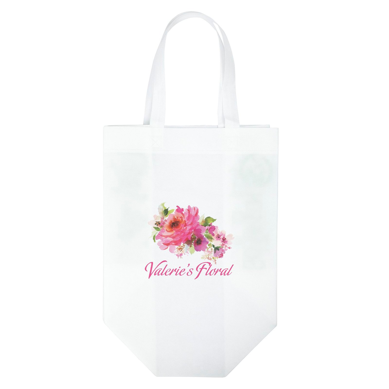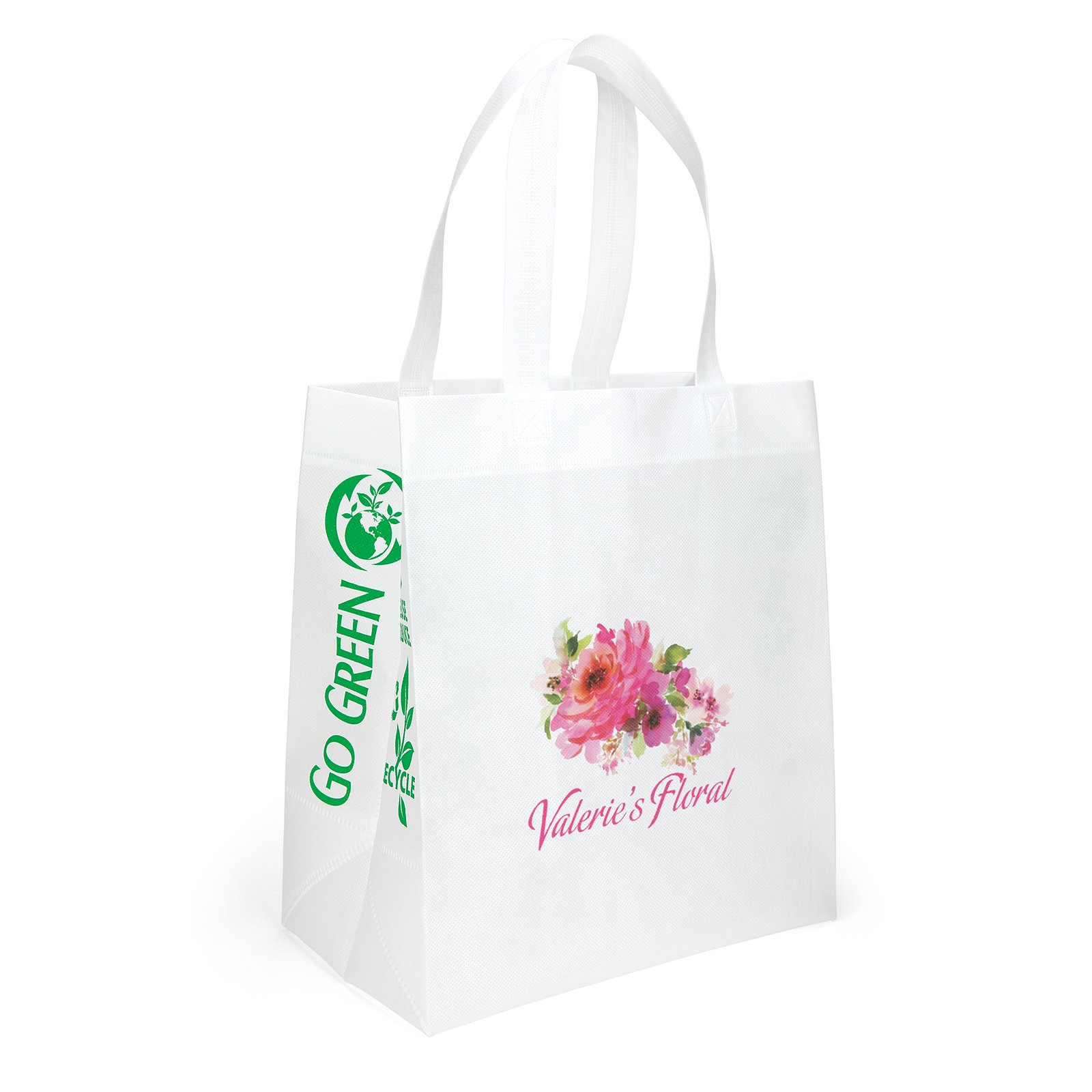 The 80 GSM non-woven Economy Tote offers a larger imprint area than standard grocery bags, along with heat-sealed handles, and fused seams. An optional plastic bottom insert is available for purchase. Stock imprinting on the side gussets includes messaging to promote reuse of the bag. Handles measure 1″W x 20″ long. 13″ W x 8″ D x 15″ H