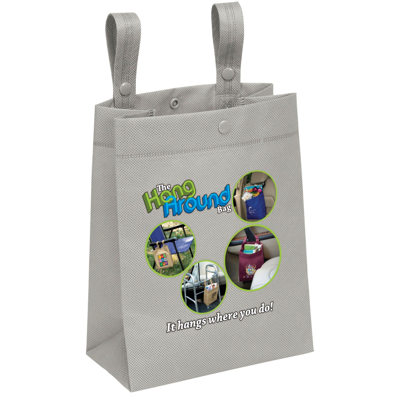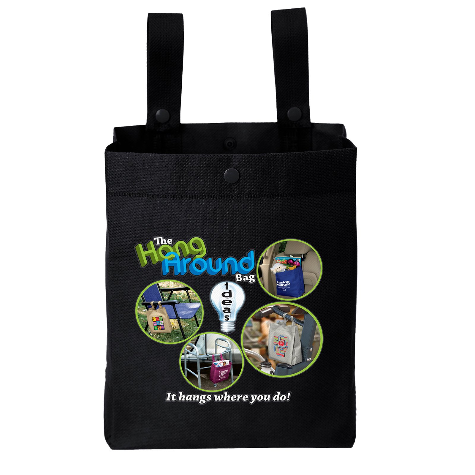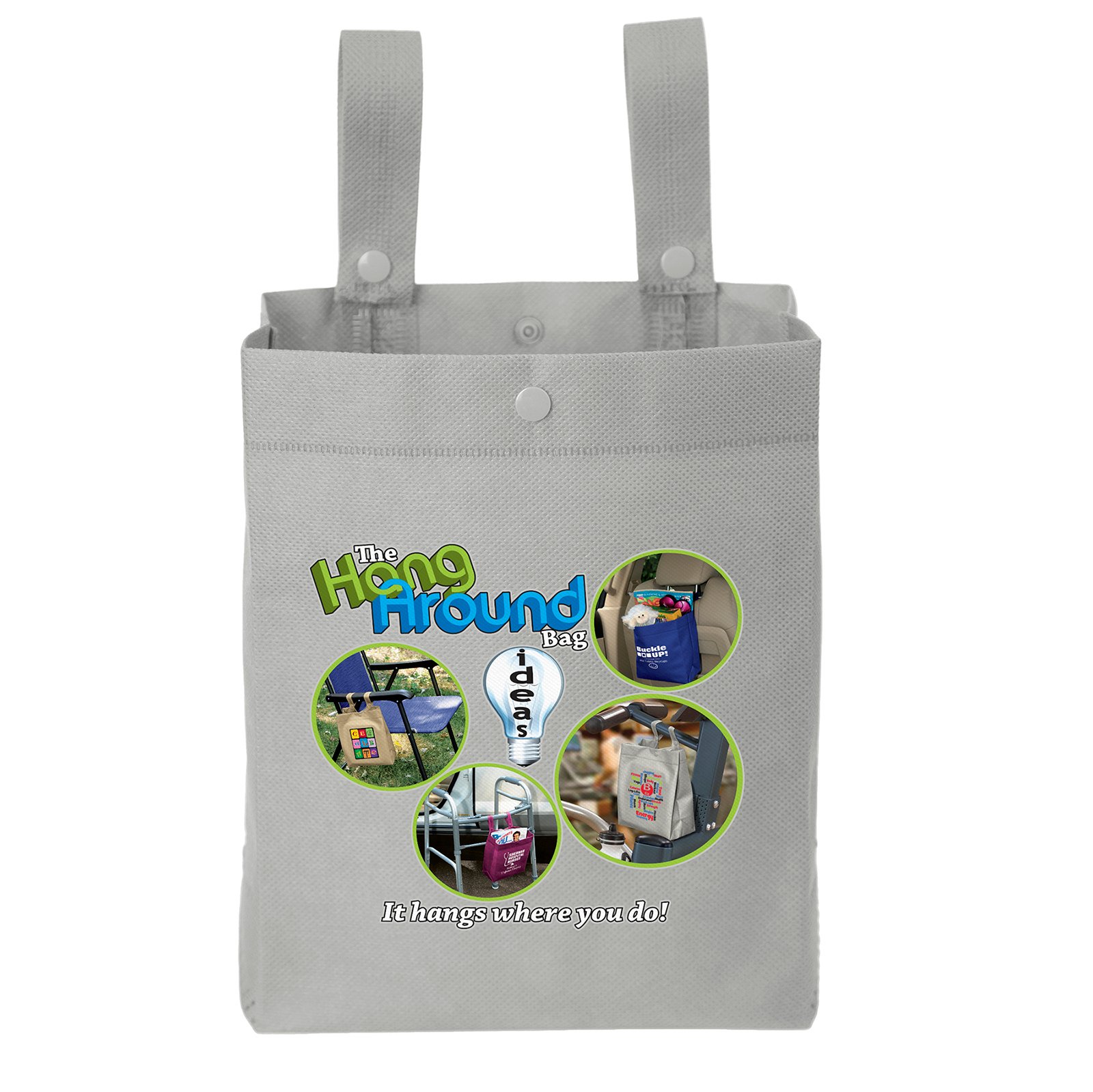 The Hang Around™ Bag’s long straps and dual snaps allow it to be attached to a chair or other item for easy access. The bag is made with premium non-woven material, fused seams and snap-top closure. An optional plastic bottom insert is available for purchase. Handles measure 1″W x 8″ long. 8″ W x 4″ D x 10″ H