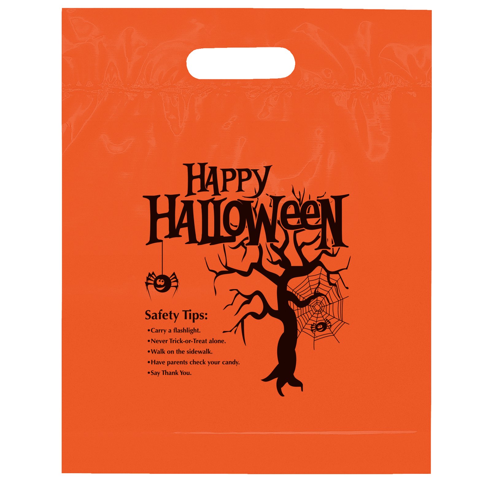 2.5 mil orange plastic bag with fold-over die cut handles and bottom gusset. Stock design with safety tips printed on one side. Add your custom imprint to the second side. 12″ W x 15″ H x 3″ D