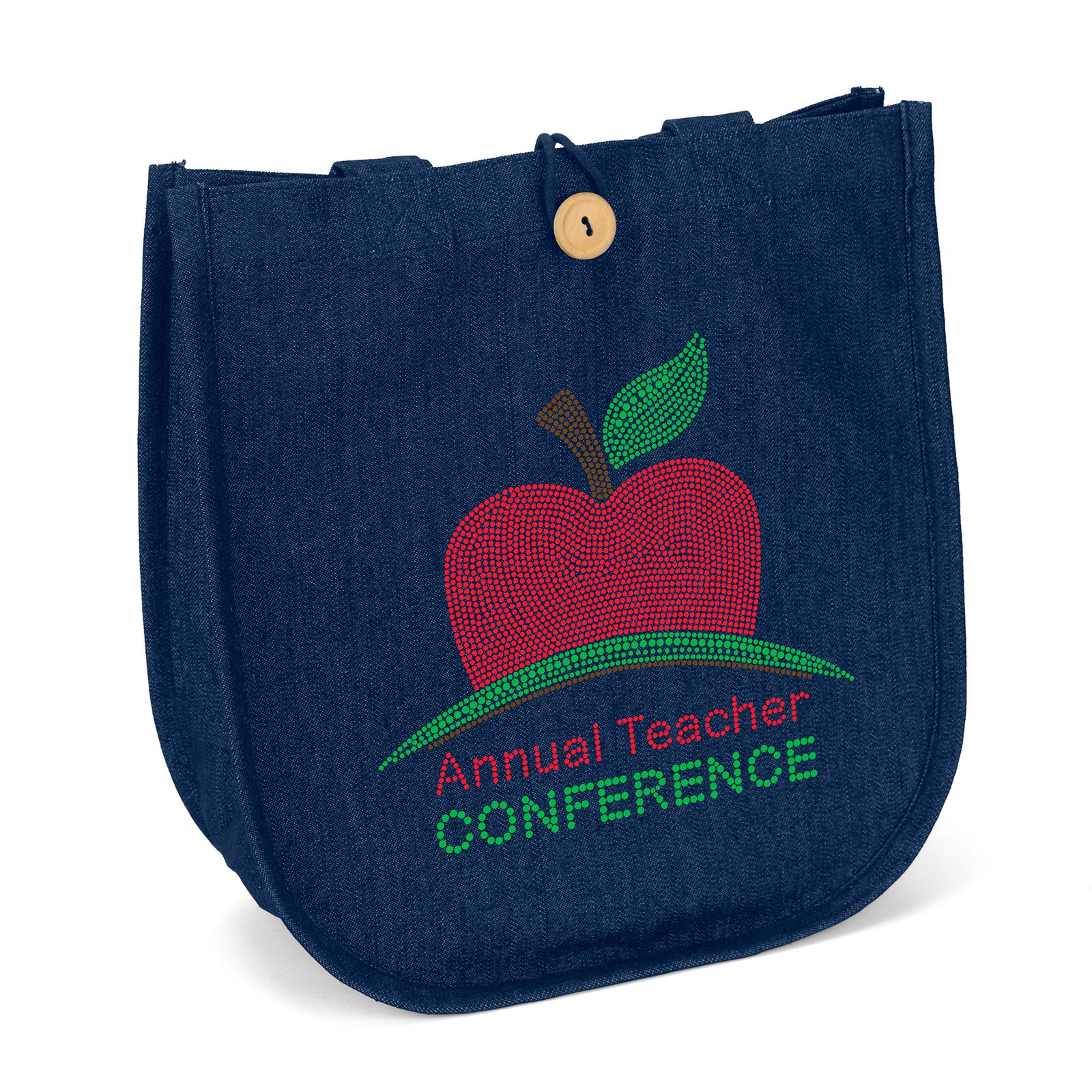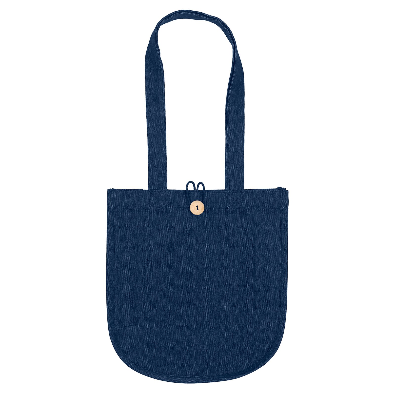 The reusable MB™ Denim Tote is made of durable 12-oz. cotton with a classic dark-wash denim look. The bag features a stylish curved bottom, a wooden button with loop closure, and 28″ long denim handles. An optional plastic bottom insert is available for purchase. *Due to the natural character of denim fabric, slight color variances will occur between bags. 12″ W x 5″ D x 13″ H