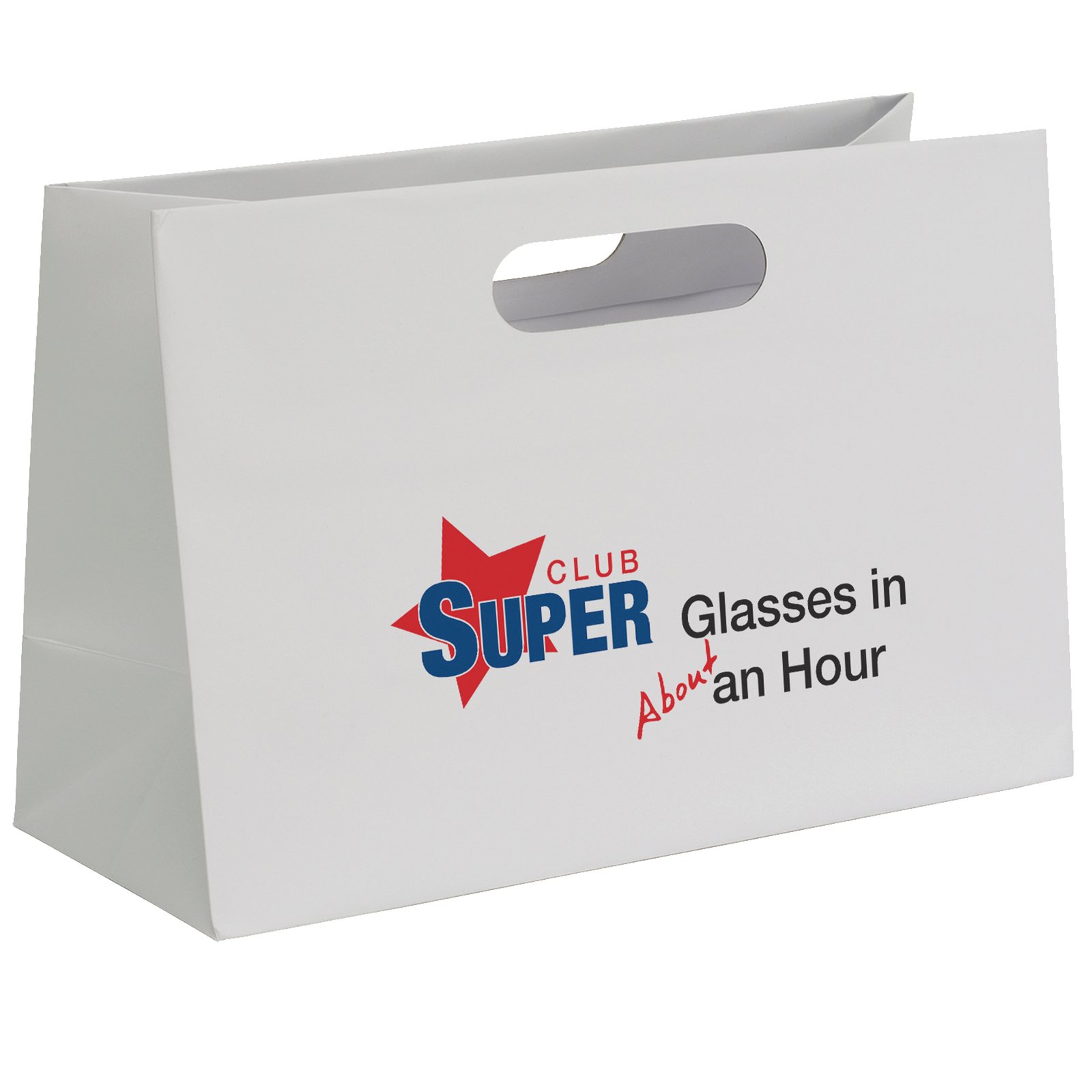 The Olivia™ Boutique Die Cut Handle tote is a heavyweight matte-laminated bag that features fold-over die cut handles and a cardboard bottom insert. 12″ W x 5″ D x 8″ H