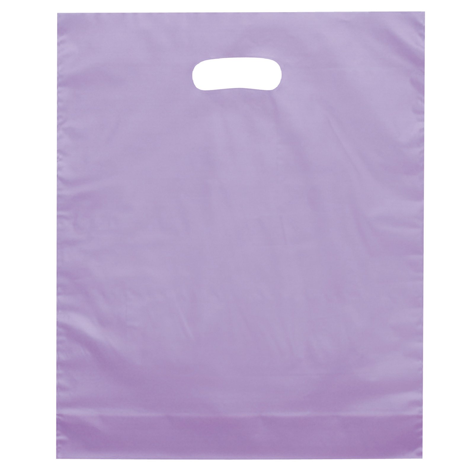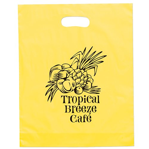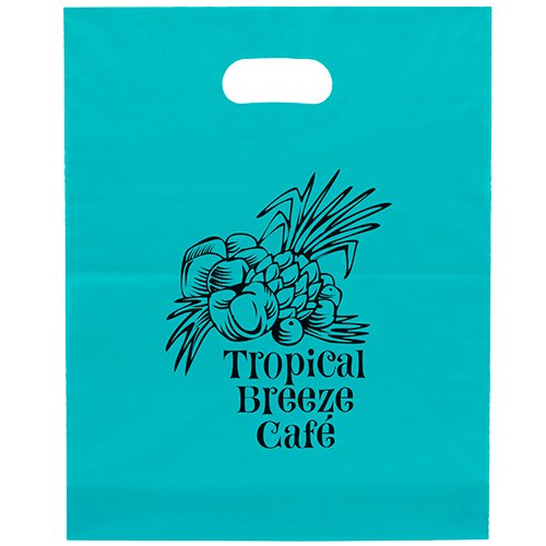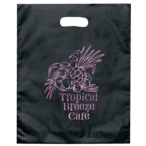 Colorful frosted hi-density plastic bag features die cut handles and a bottom gusset. 12″ W x 3″ D x 15″ H