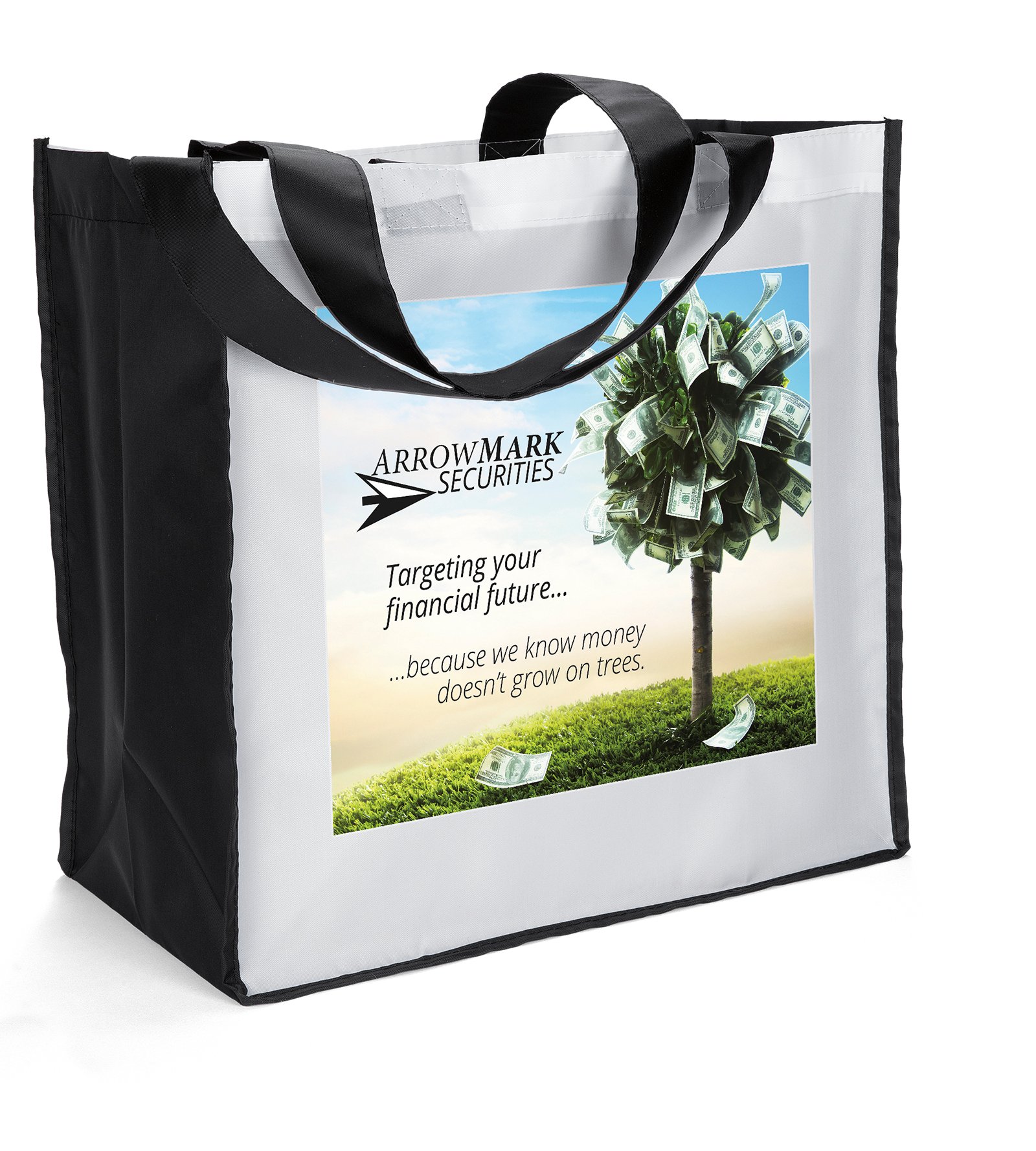The Picasso Tote has white 230-T polyester front and back panels accented by black gussets and handles. An optional plastic bottom insert is available for purchase. Handles measure 1 1/2″W x 28″ long. 14″ W x 8″ D x 14″ H