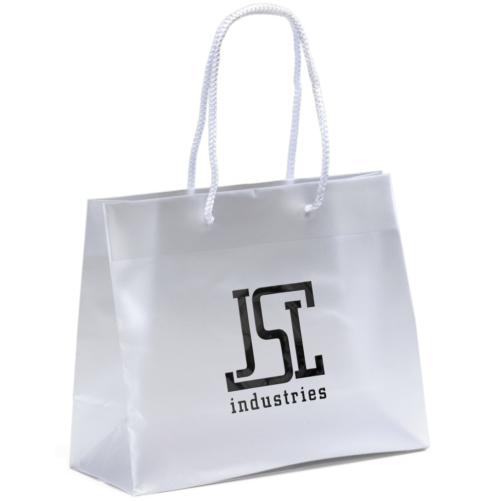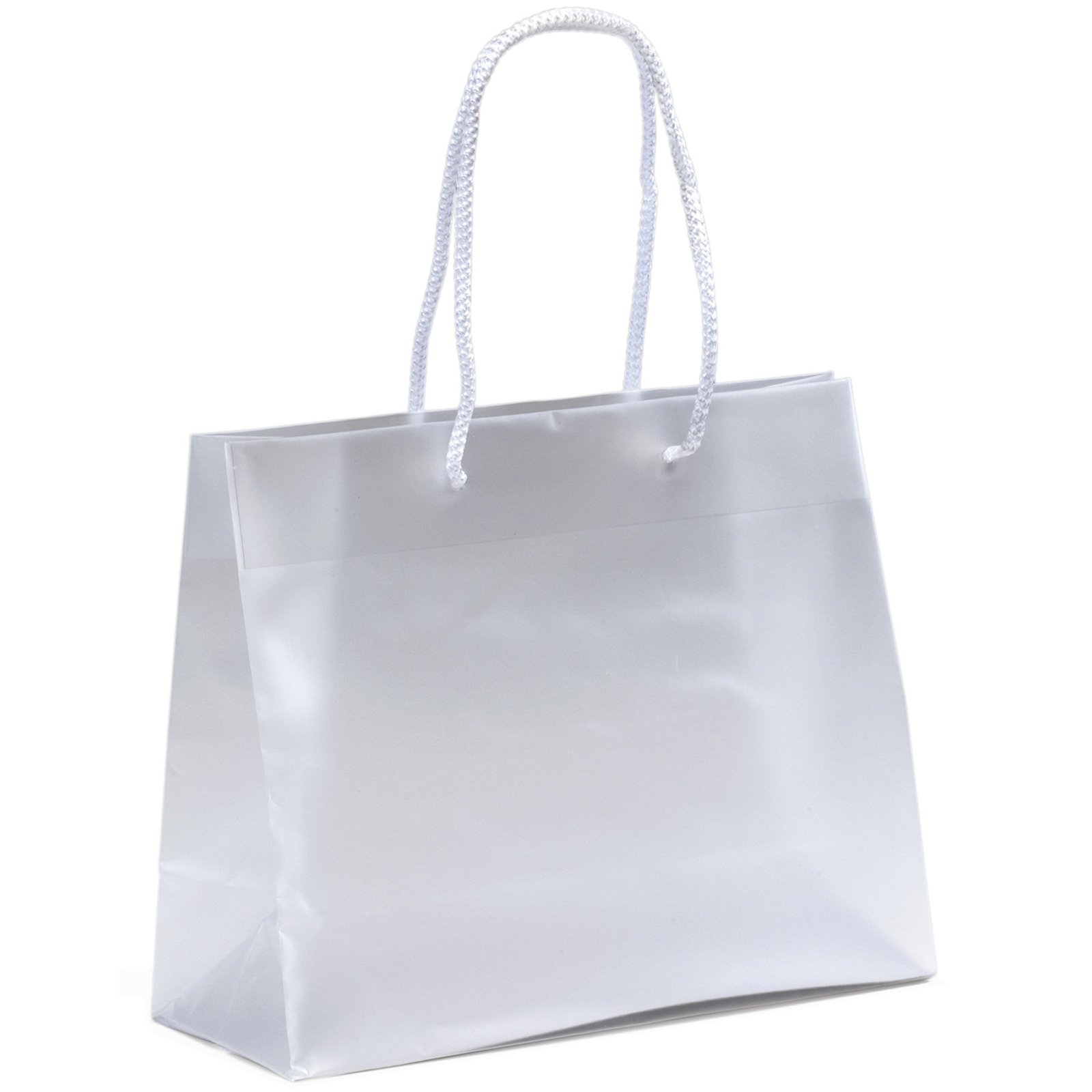 Frosted hi-density plastic bags feature macramé handles, a reinforced fold over top, and a cardboard bottom insert. 10″ W x 4″ D x 8″ H