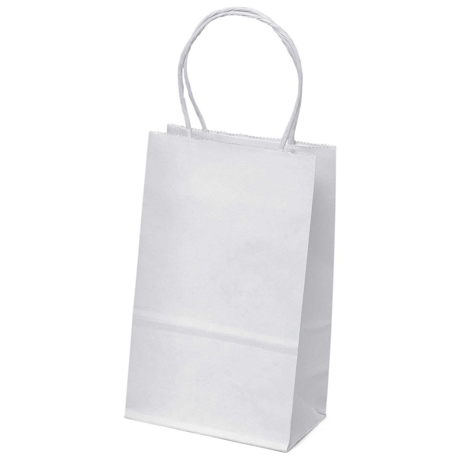 The Pup White Shopper is made with white kraft paper and features twisted paper handles and a serrated cut top. 5 1/2″ W x 3 1/2″ D x 8″ H