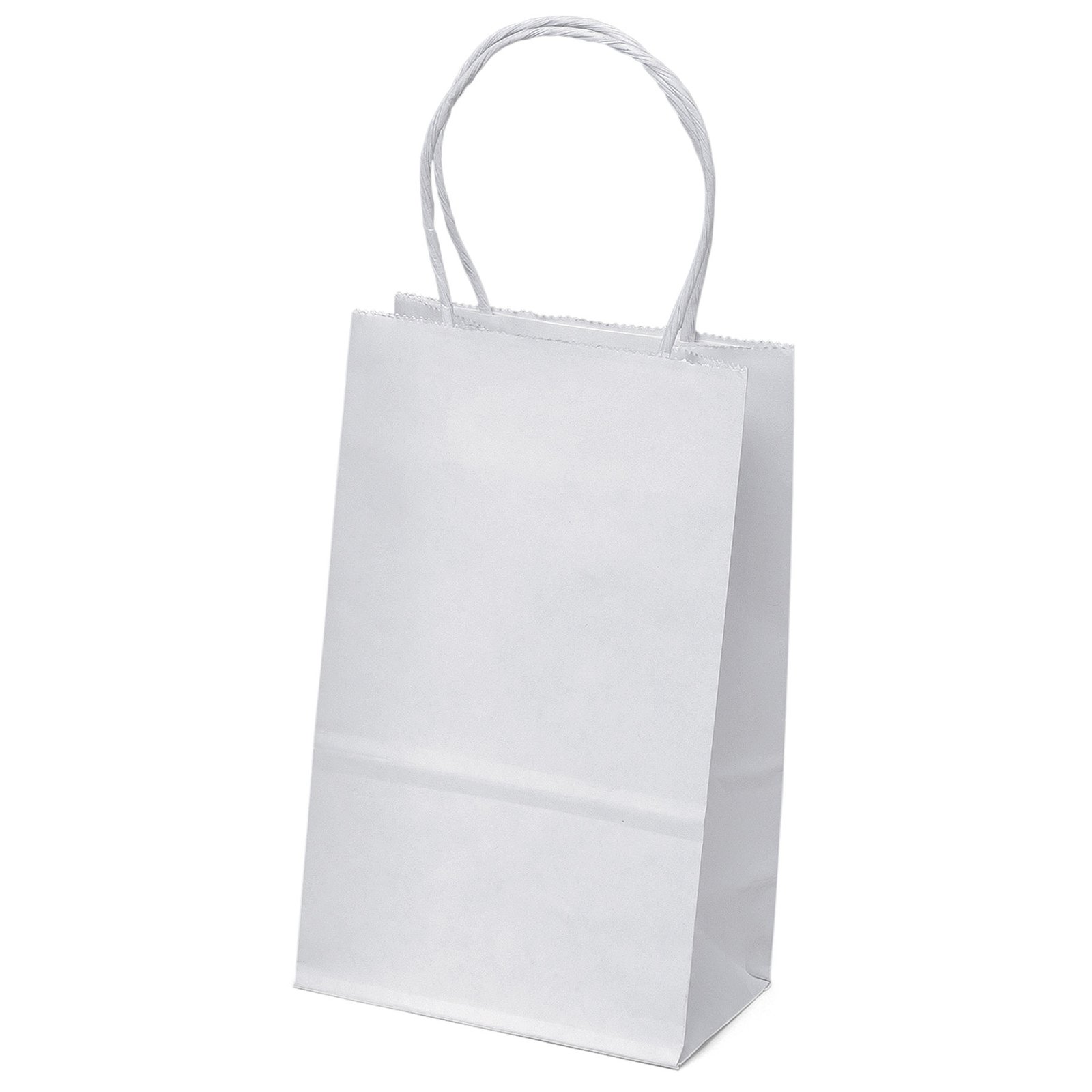 The Pup White Shopper is made with white kraft paper and features twisted paper handles and a serrated cut top. 5 1/2″ W x 3 1/2″ D x 8″ H
