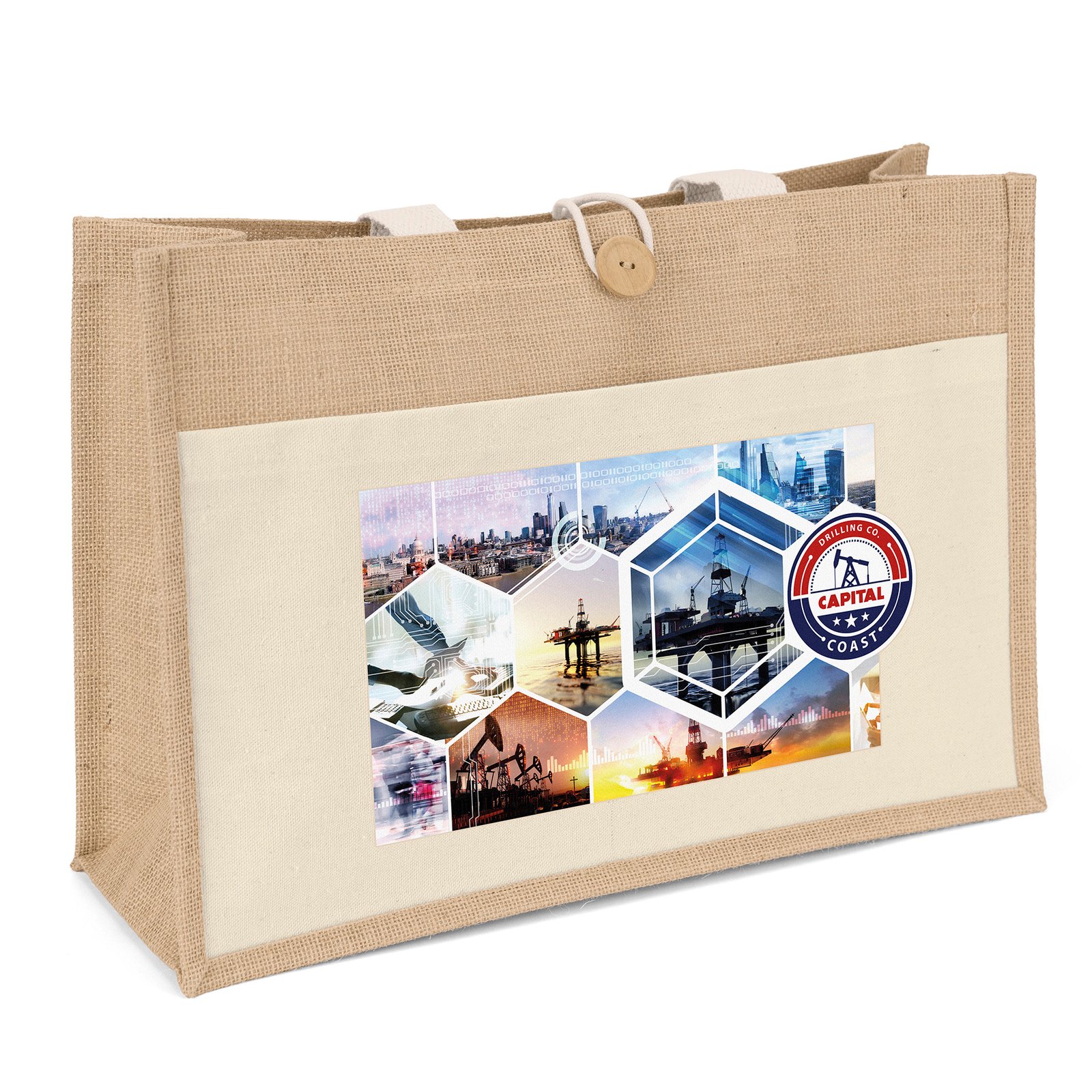 The Riley™ Jute Tote features a natural-colored jute exterior paired with a 10-oz. cotton front pocket offering a generous imprint area, 28″-long cotton twill handles, and a wooden button with loop closure. The interior is laminated for added durability. *Due to the natural character of cotton fabric, slight color variances will occur between bags. 17″ W x 6″ D x 12″ H