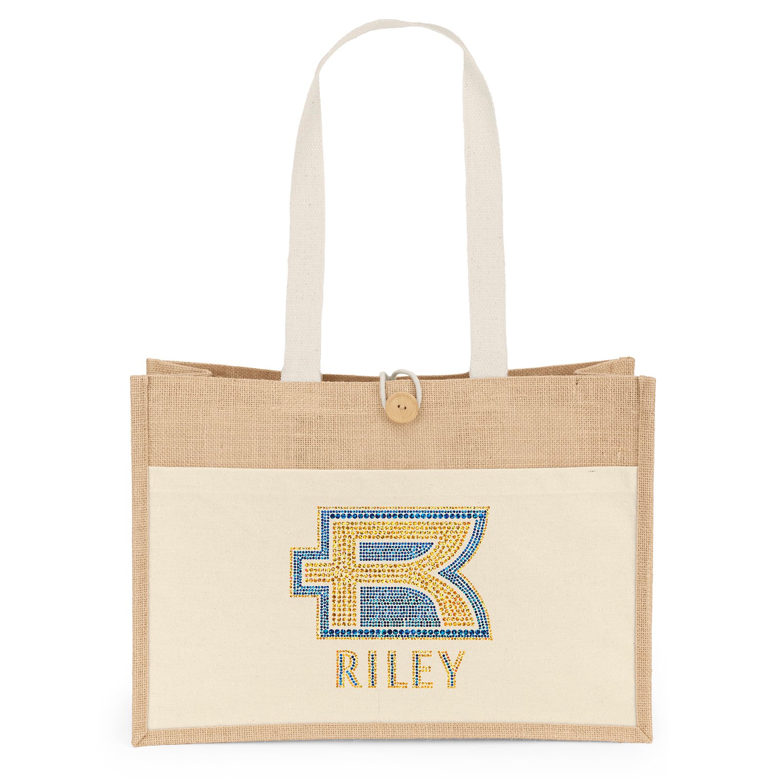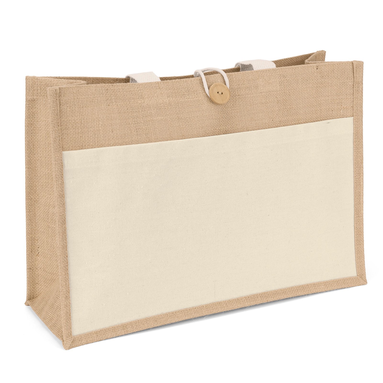 The Riley™ Jute Tote features a natural-colored jute exterior paired with a 10-oz. cotton front pocket offering a generous imprint area, 28″-long cotton twill handles, and a wooden button with loop closure. The interior is laminated for added durability. *Due to the natural character of cotton fabric, slight color variances will occur between bags. 17″ W x 6″ D x 12″ H