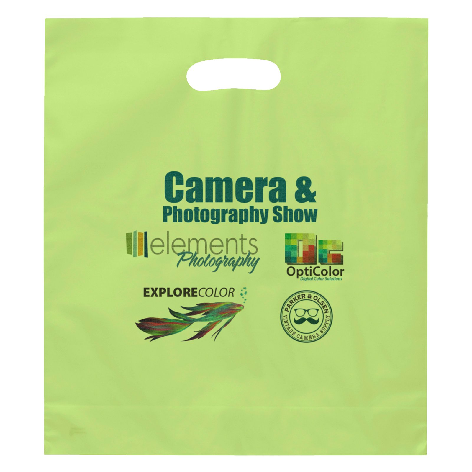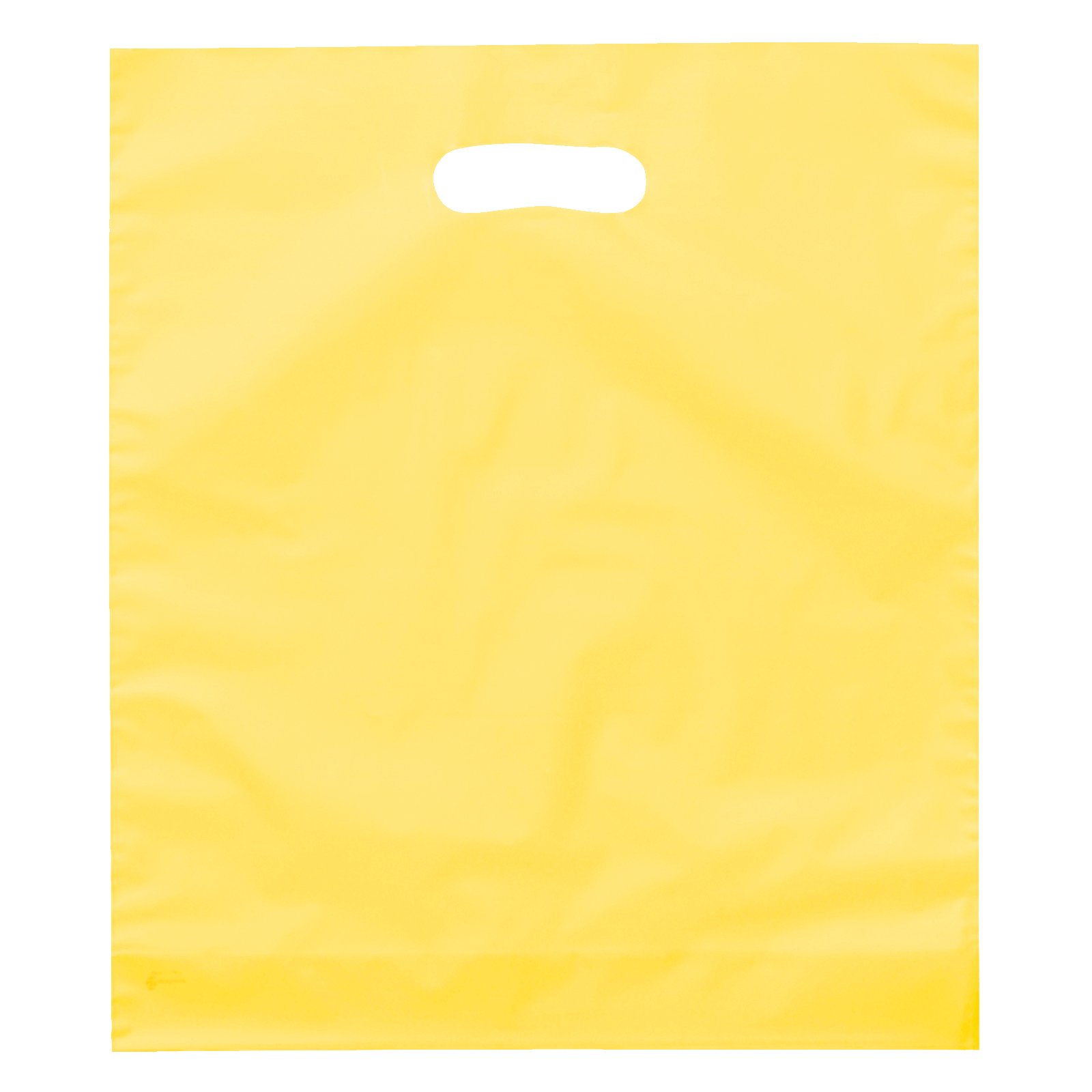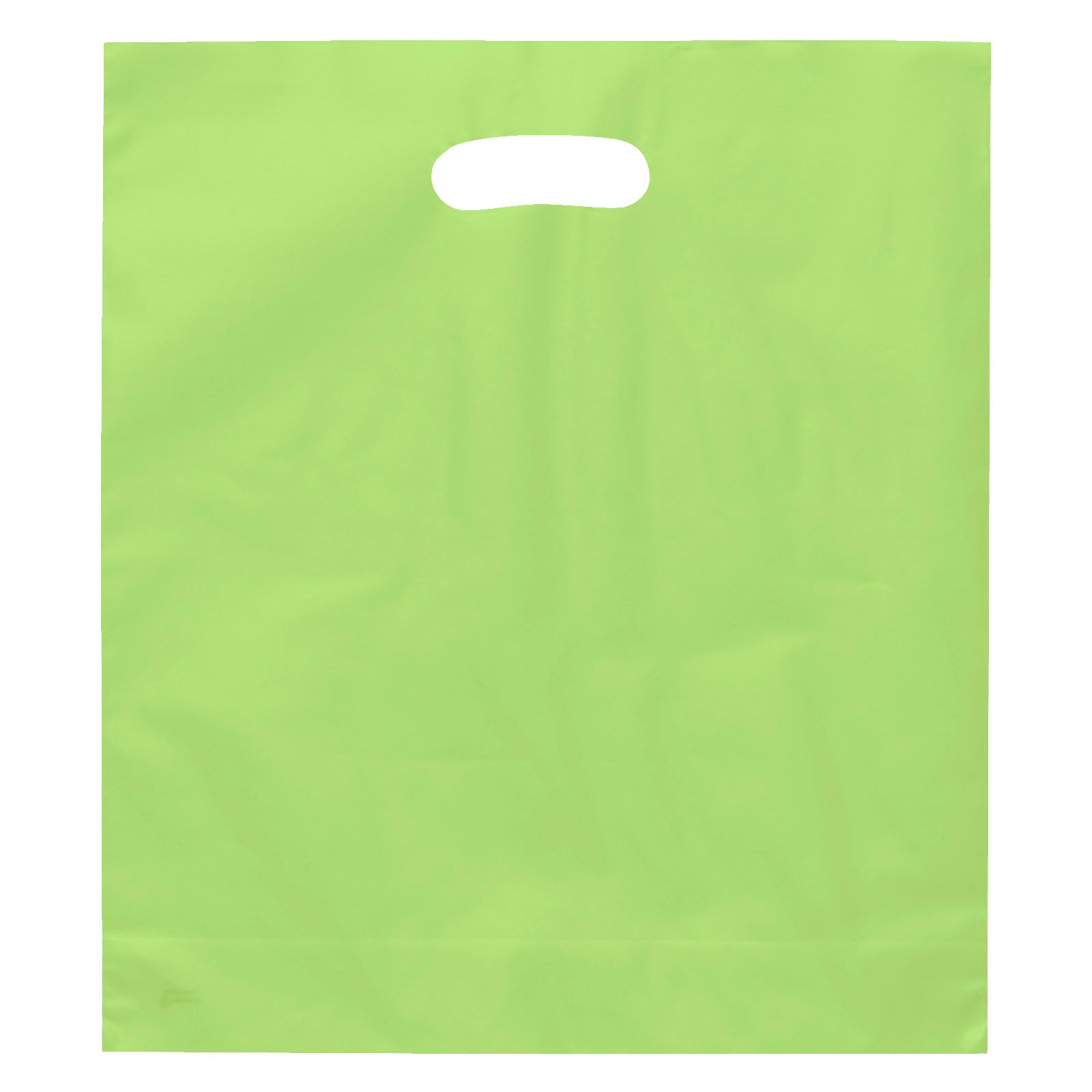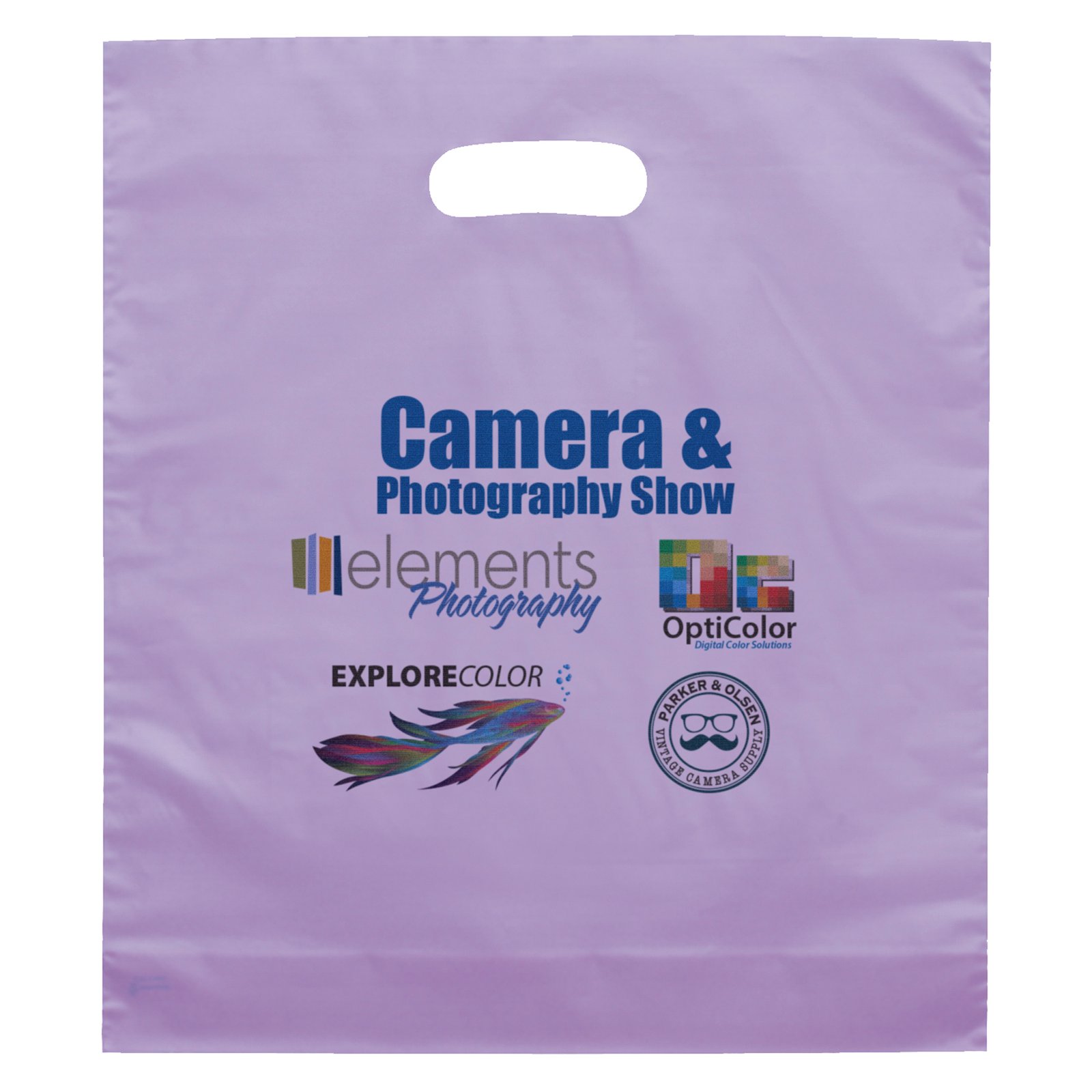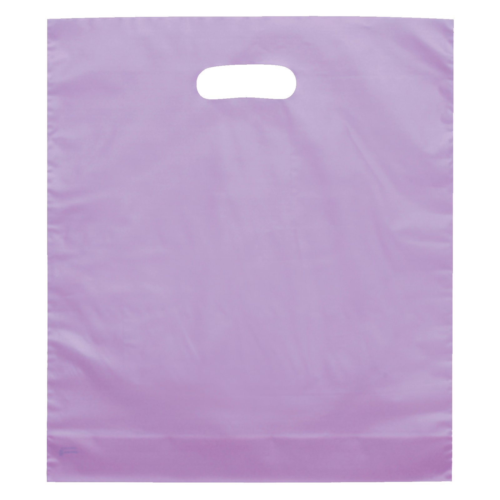 Colorful frosted hi-density plastic bag features die cut handles and a bottom gusset. 15″ W x 4″ D x 18″ H