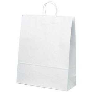 The Stephanie White Shopper is made with white kraft paper and features twisted paper handles and a serrated cut top. 16″ W x 6″ D x 19″ H