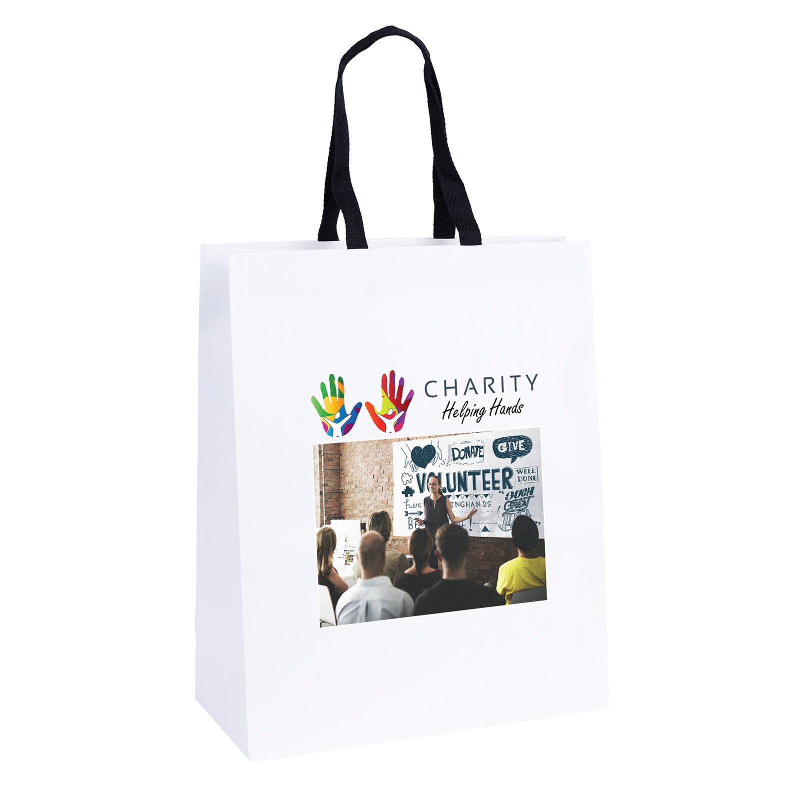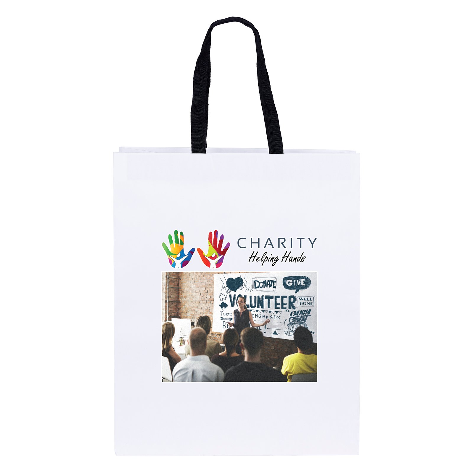 The Teak Woven-Handle White Eurotote is made with 120 GSM white paper and features distinctive black handles and a cardboard bottom insert. Handles measure 3/4″W x 14″ long. 13″ W x 16″ H x 6″ D