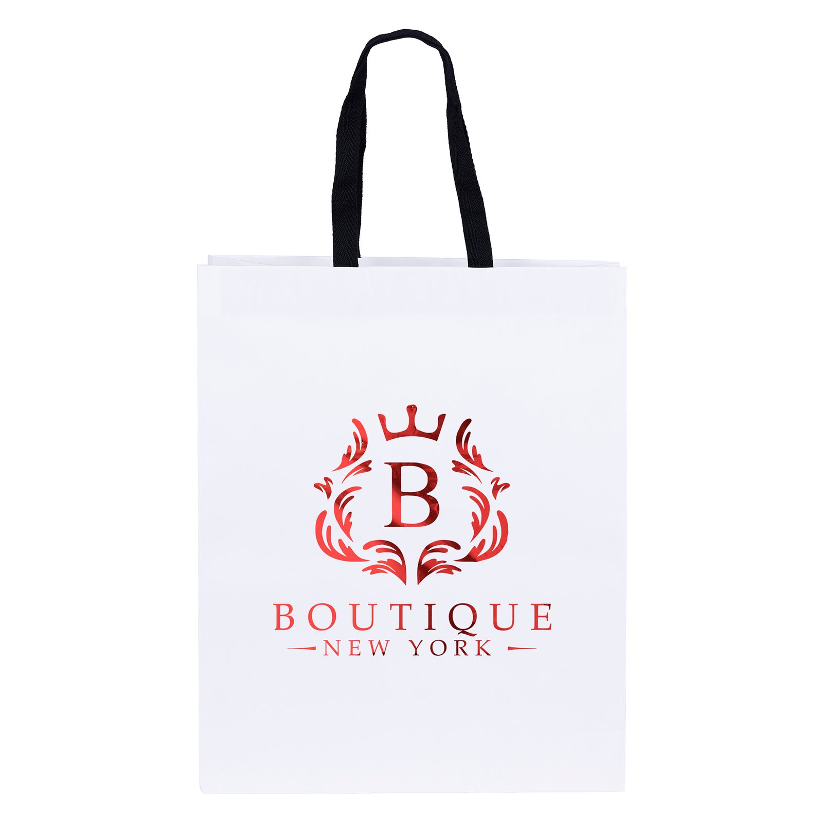 The Teak Woven-Handle White Eurotote is made with 120 GSM white paper and features distinctive black handles and a cardboard bottom insert. Handles measure 3/4″W x 14″ long. 13″ W x 16″ H x 6″ D