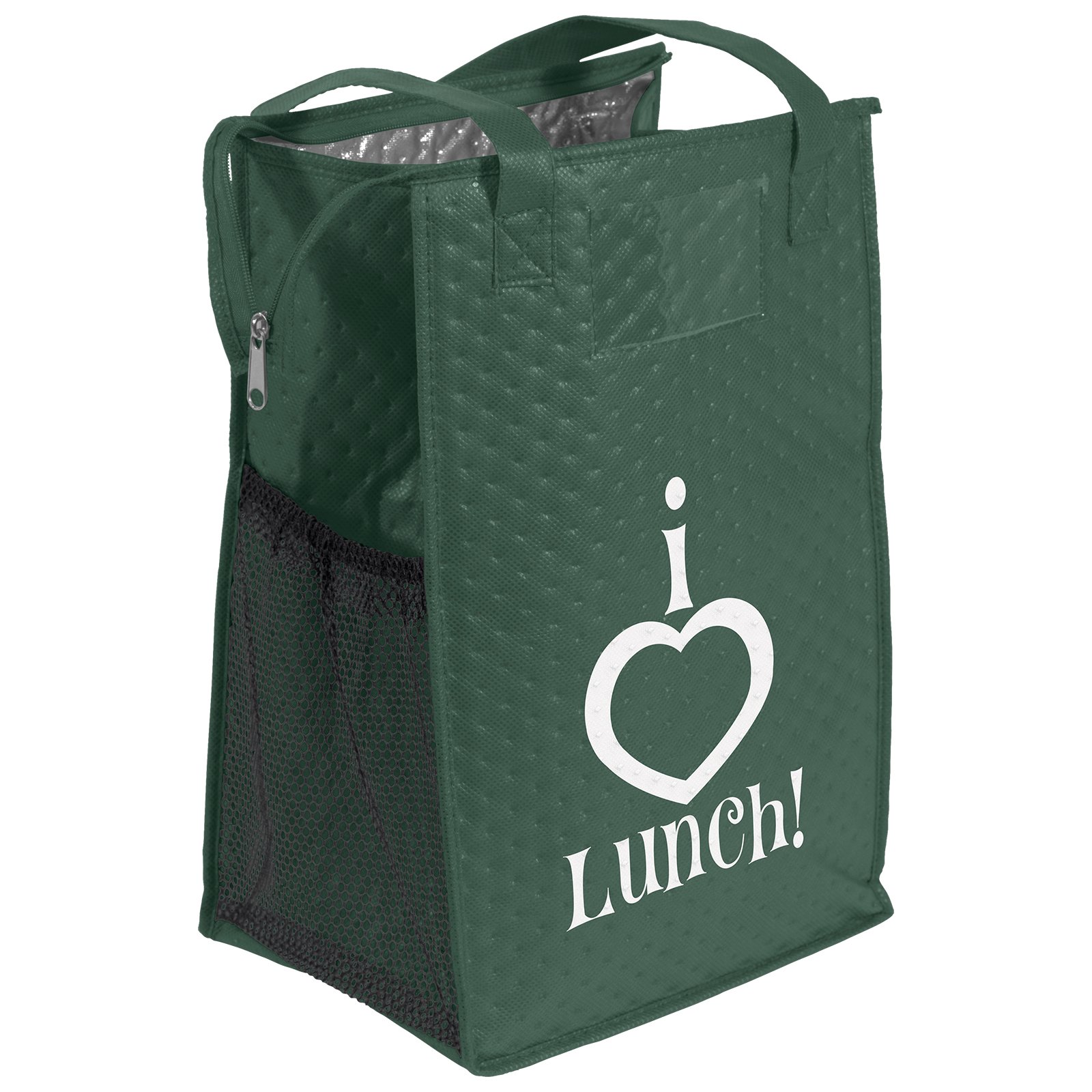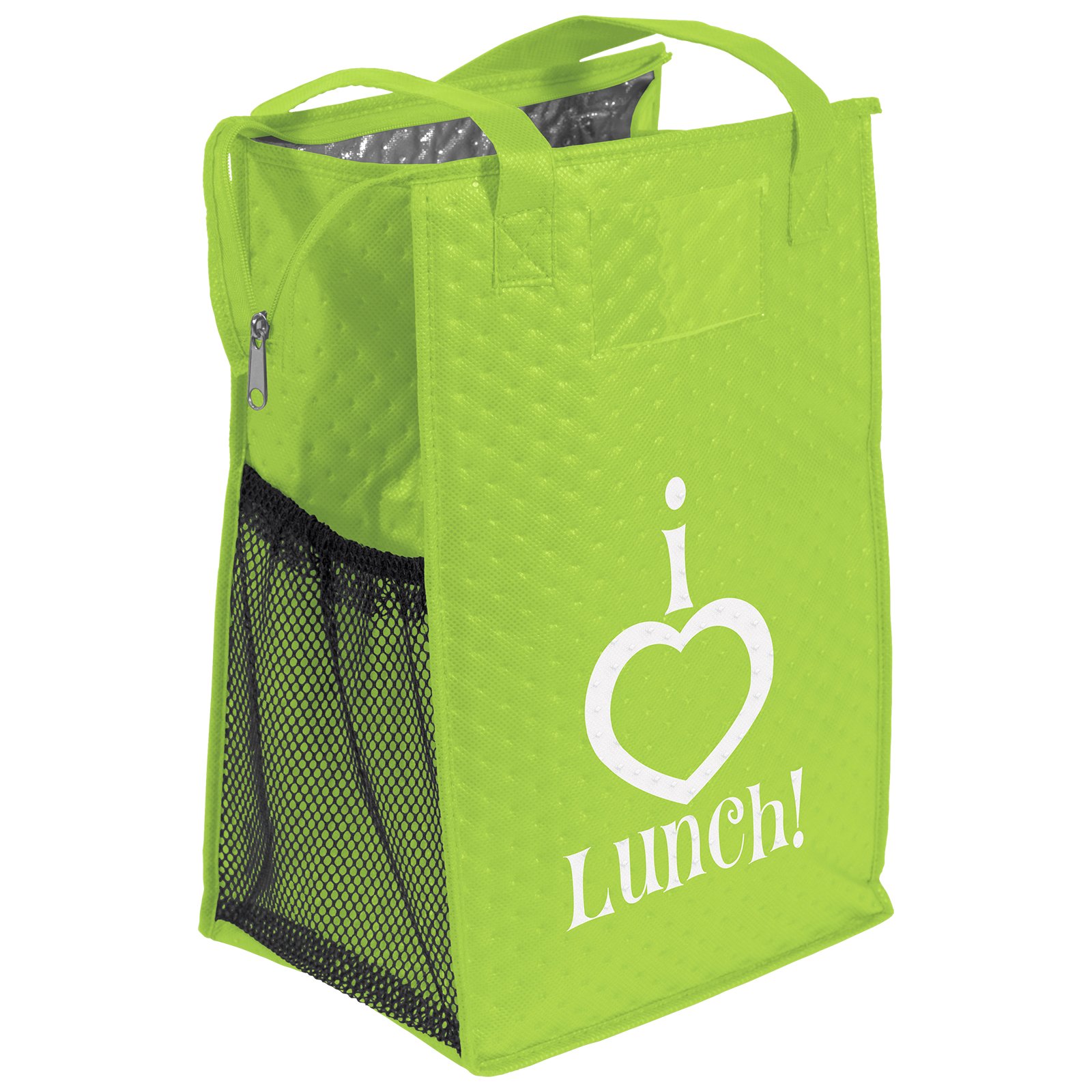 The Therm-O Super Snack™ is insulated to keep contents hot or cold. This lunch-size tote is made with a durable 238 combined GSM premium non-woven exterior, thermal foil interior, reinforced handles, zippered closure, and plastic bottom insert. Handles measure 1″W x 20″ long. 9″ W x 7″ D x 14″ H