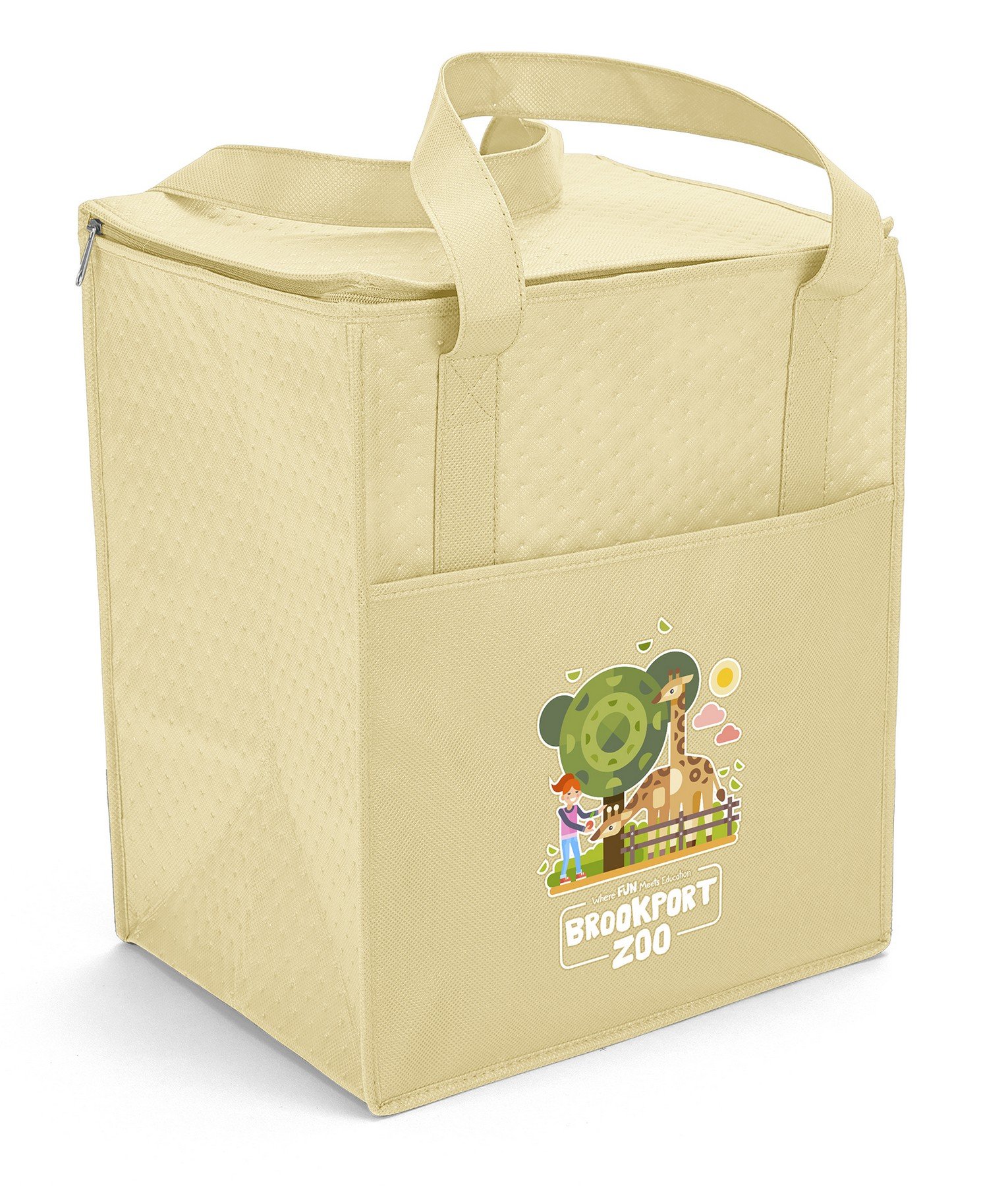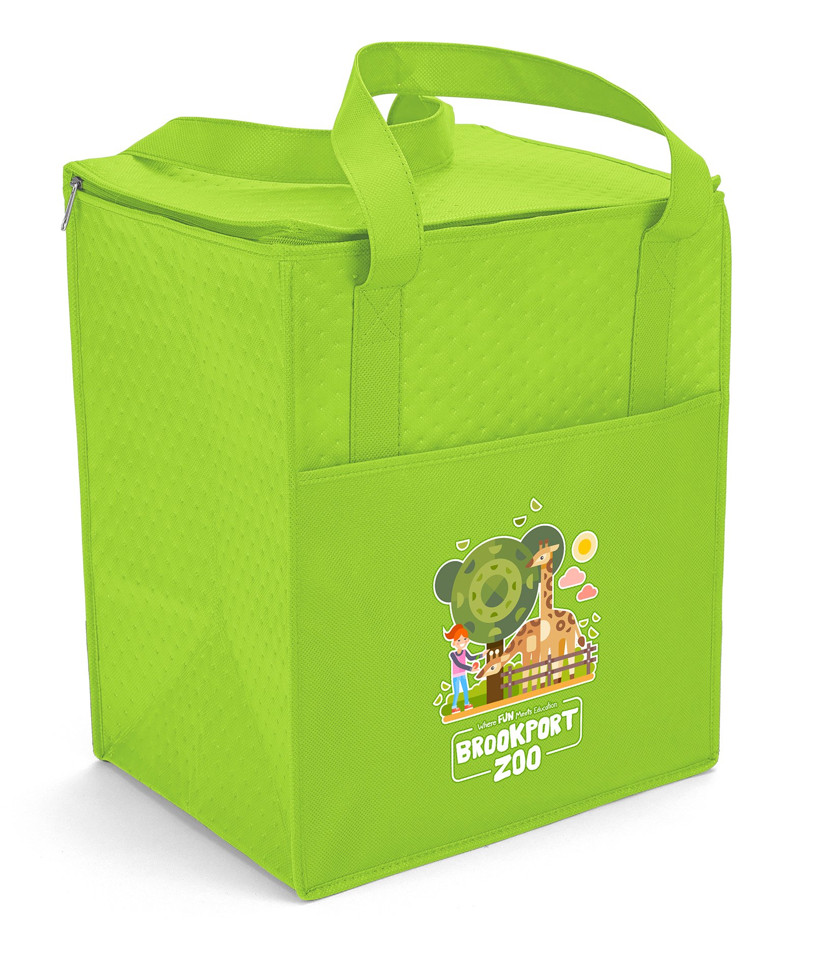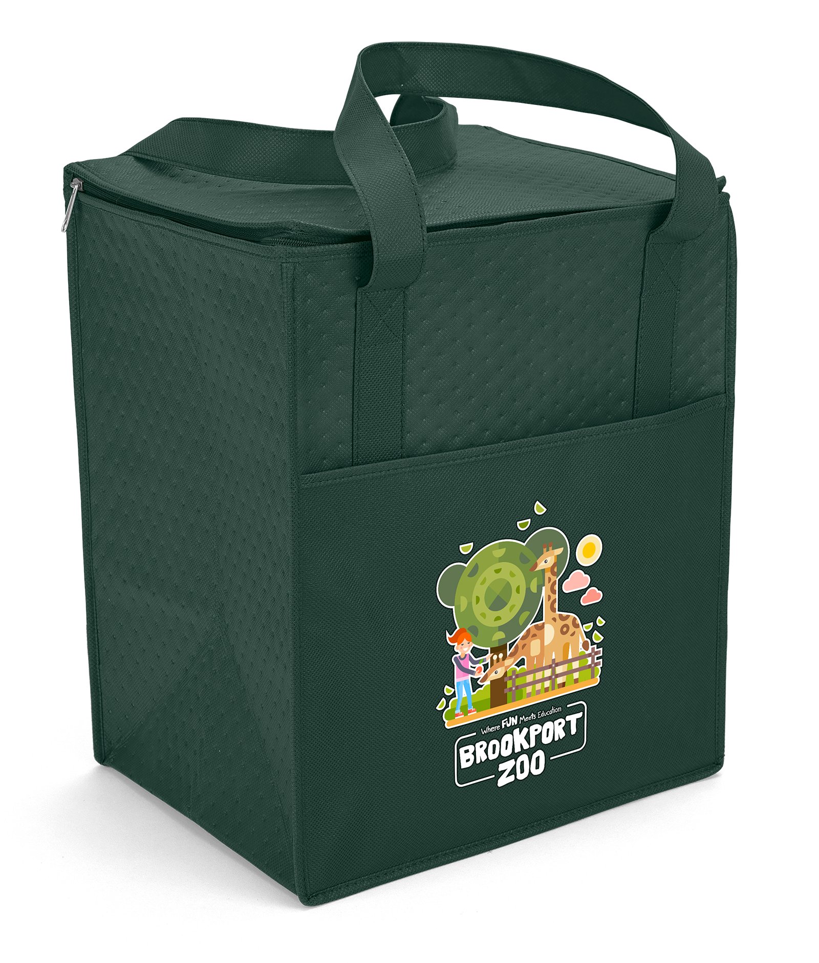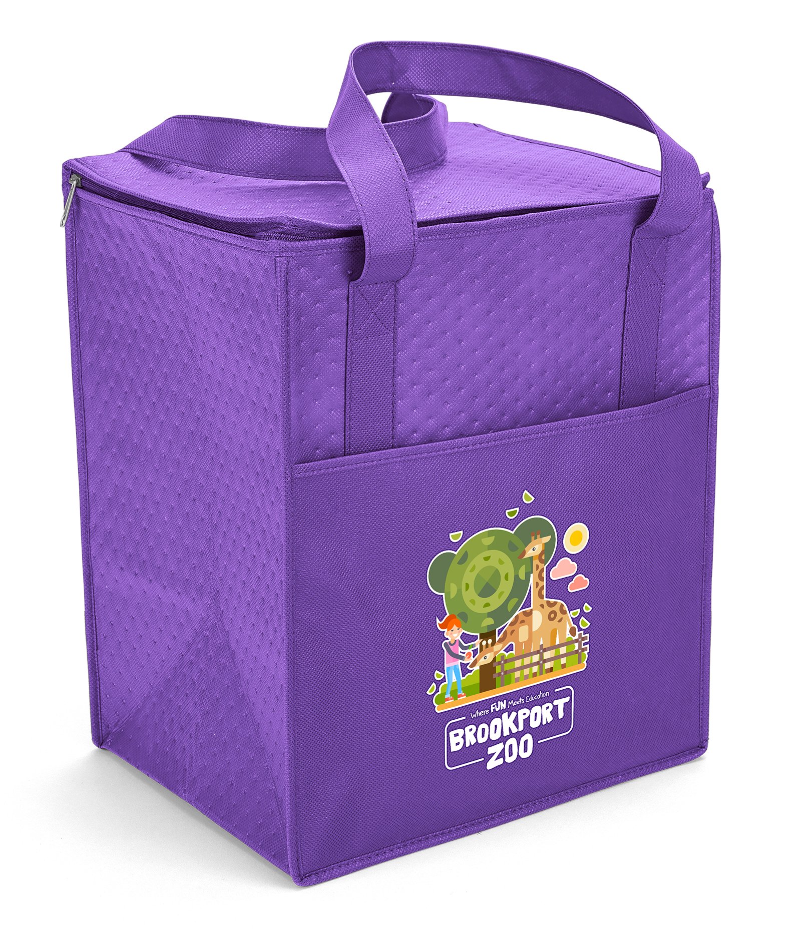 The Therm-O Super Tote™ is insulated to keep contents hot or cold. This large tote features a durable 238 combined GSM premium non-woven exterior, thermal foil interior, dual-reinforced handles, and plastic bottom insert. The Therm-O Super Tote also has a front pocket and a flat-top, zip-close lid that provides an additional imprint area. Handles measure 1 1/2″W x 22″ long. 13″ W x 10″ D x 15″ H