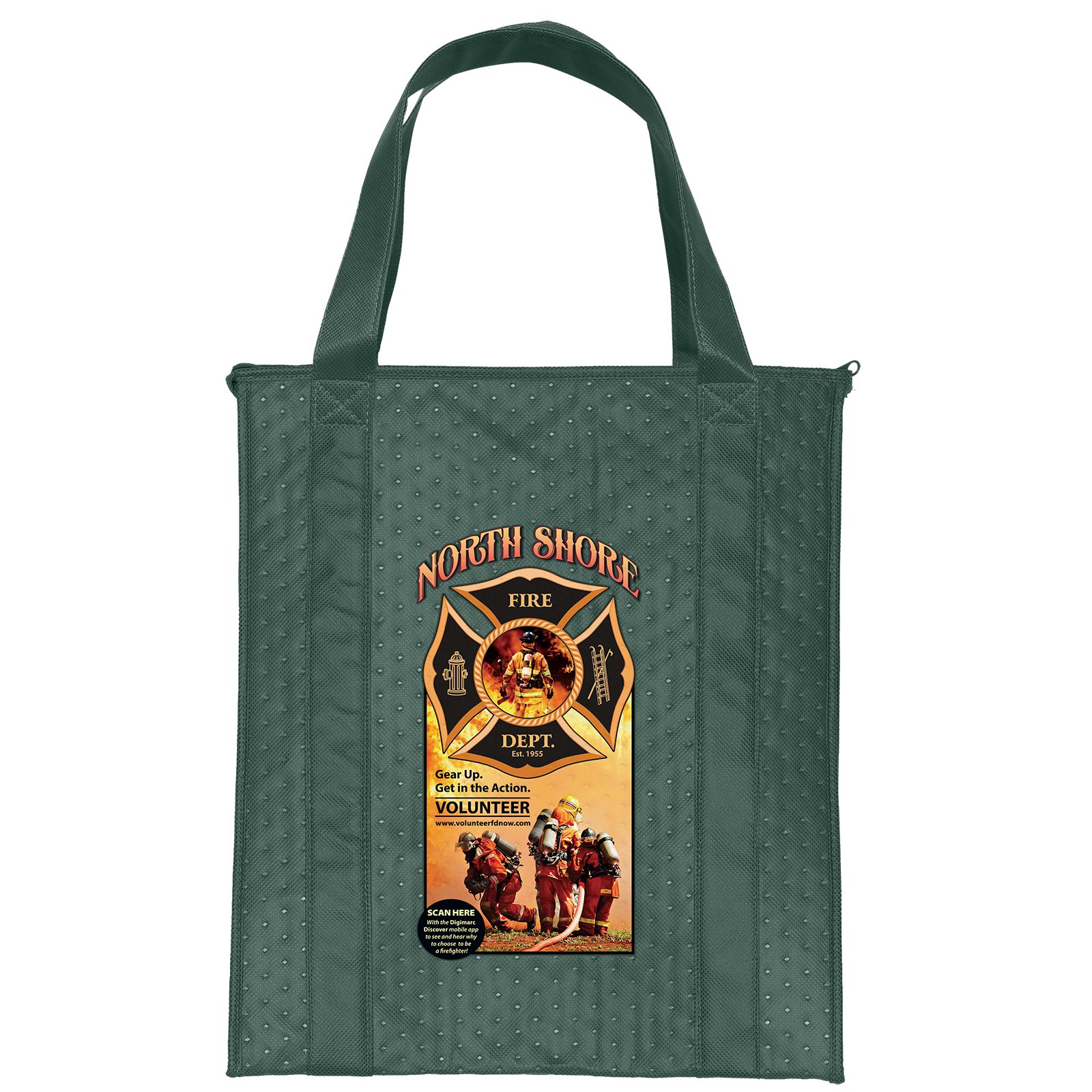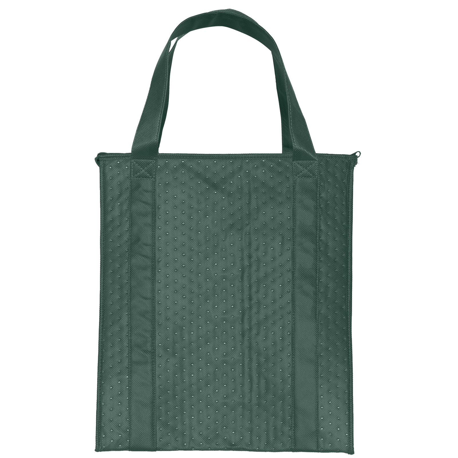 The Therm-O Tote™ is insulated to keep contents hot or cold. This large tote features a durable 238 combined GSM premium non-woven exterior, thermal foil interior, dual-reinforced handles, and plastic bottom insert. Handles measure 1 1/4″W x 20″ long. 13″ W x 10″ D x 15″ H