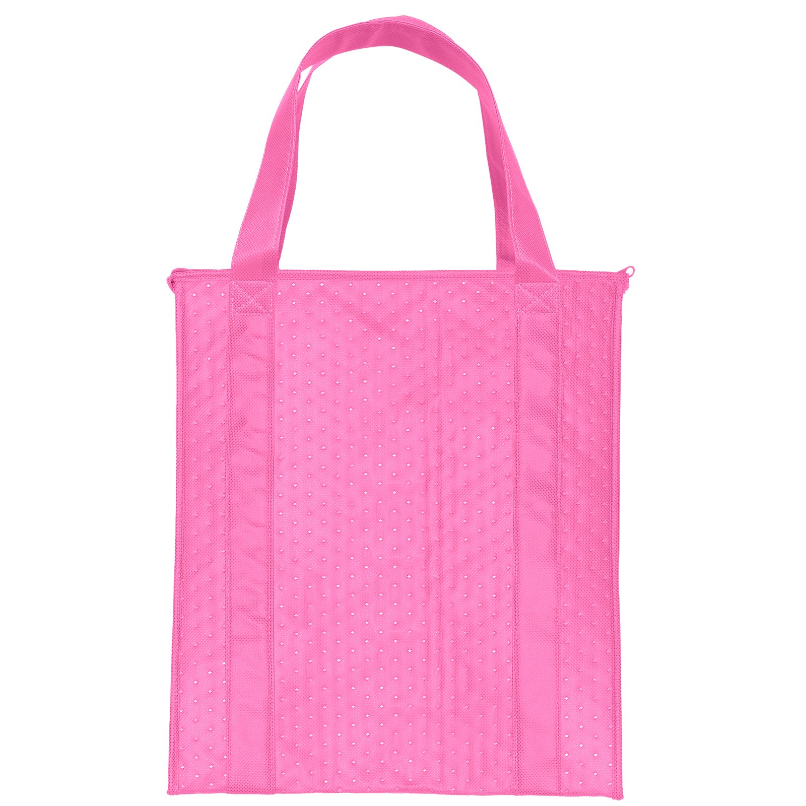 The insulated Therm-O Tote™ collection was created to keep contents hot or cold. These large totes feature a durable 238 combined GSM premium non-woven exterior, thermal foil interior, dual-reinforced handles and plastic bottom insert. Handles measure 1 1/4″W x 20″ long. 13″ W x 10″ D x 15″ H