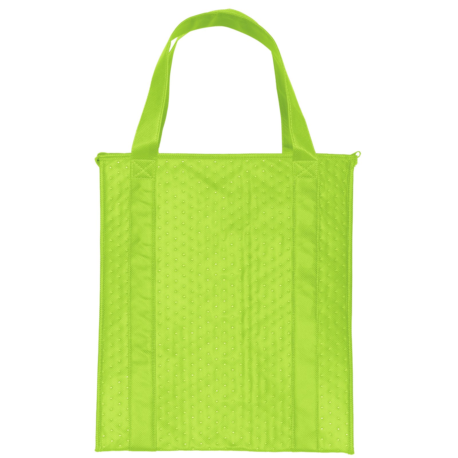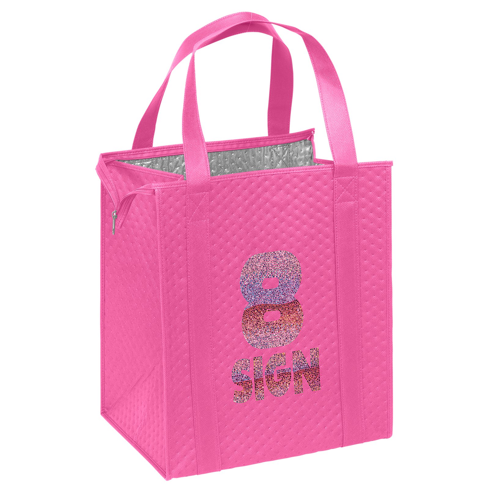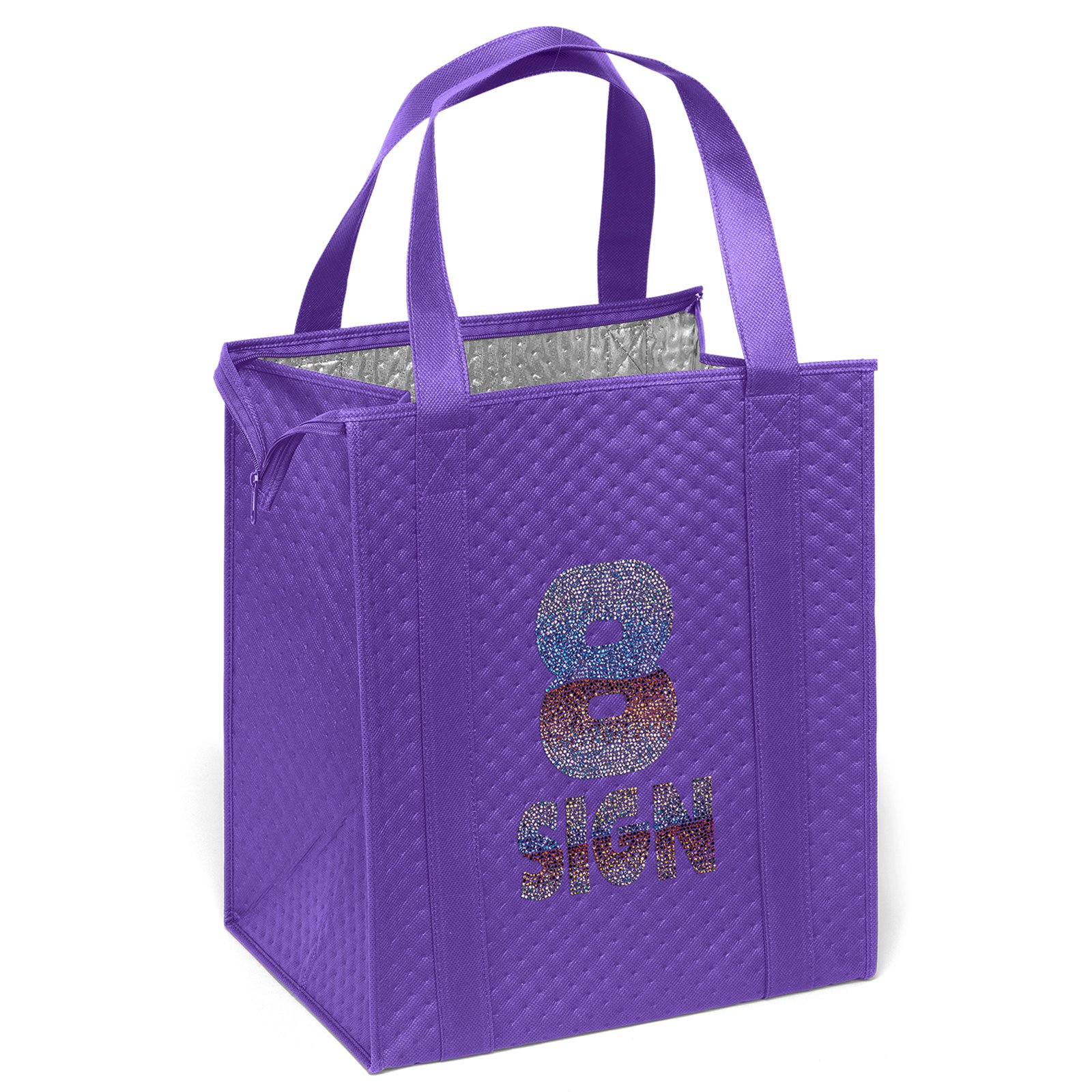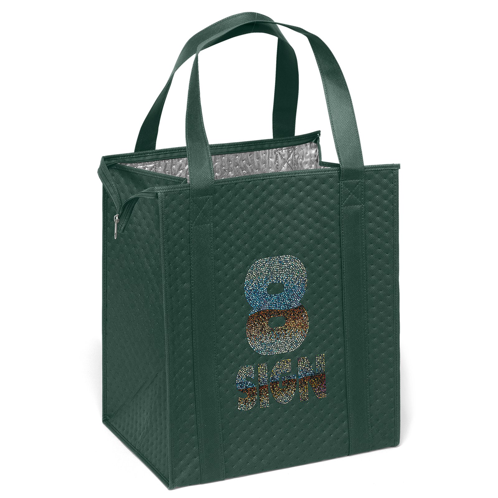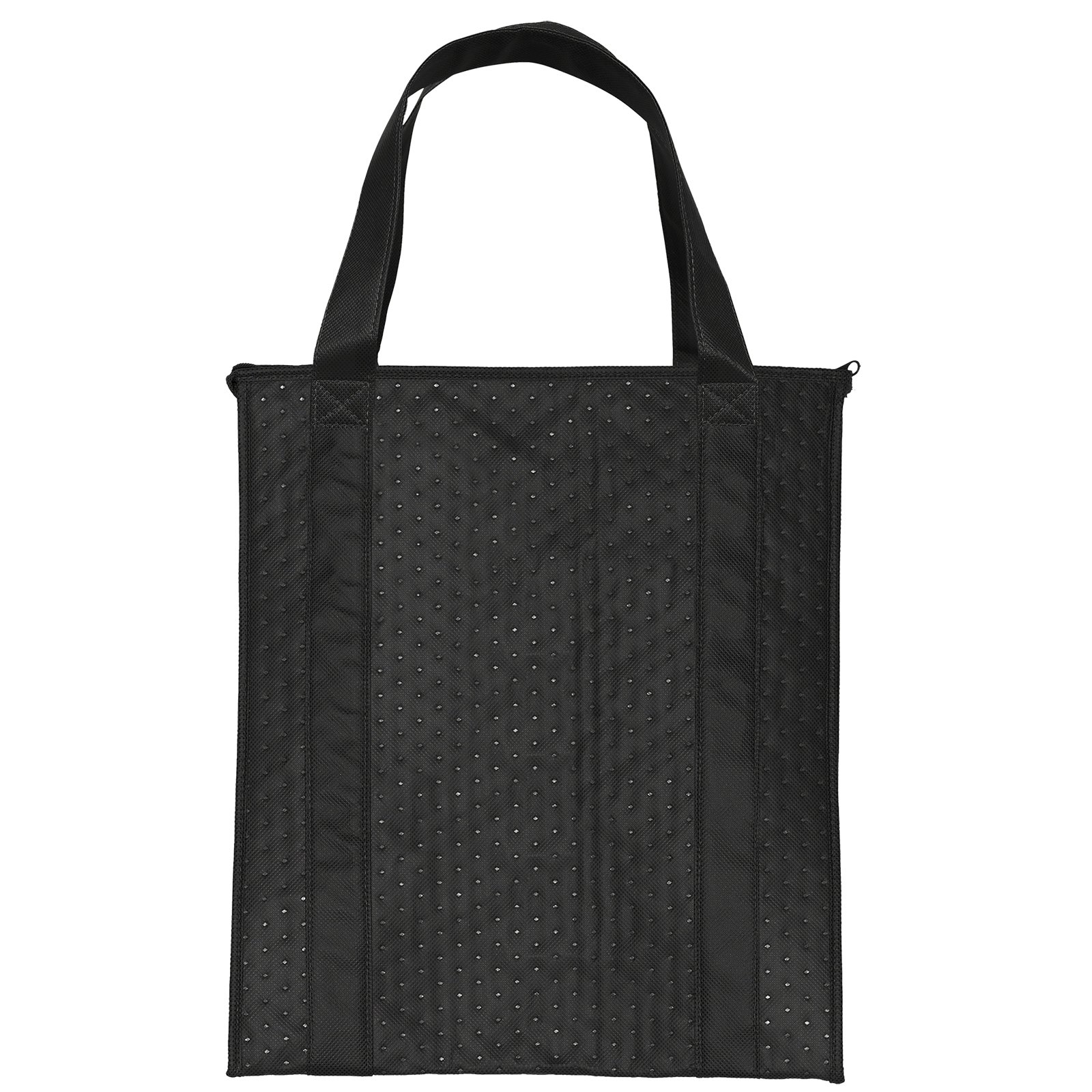 The Therm-O Tote™ is insulated to keep contents hot or cold. This large tote features a durable 238 combined GSM premium non-woven exterior, thermal foil interior, dual-reinforced handles, and plastic bottom insert. Handles measure 1 1/4″W x 20″ long. 13″ W x 10″ D x 15″ H