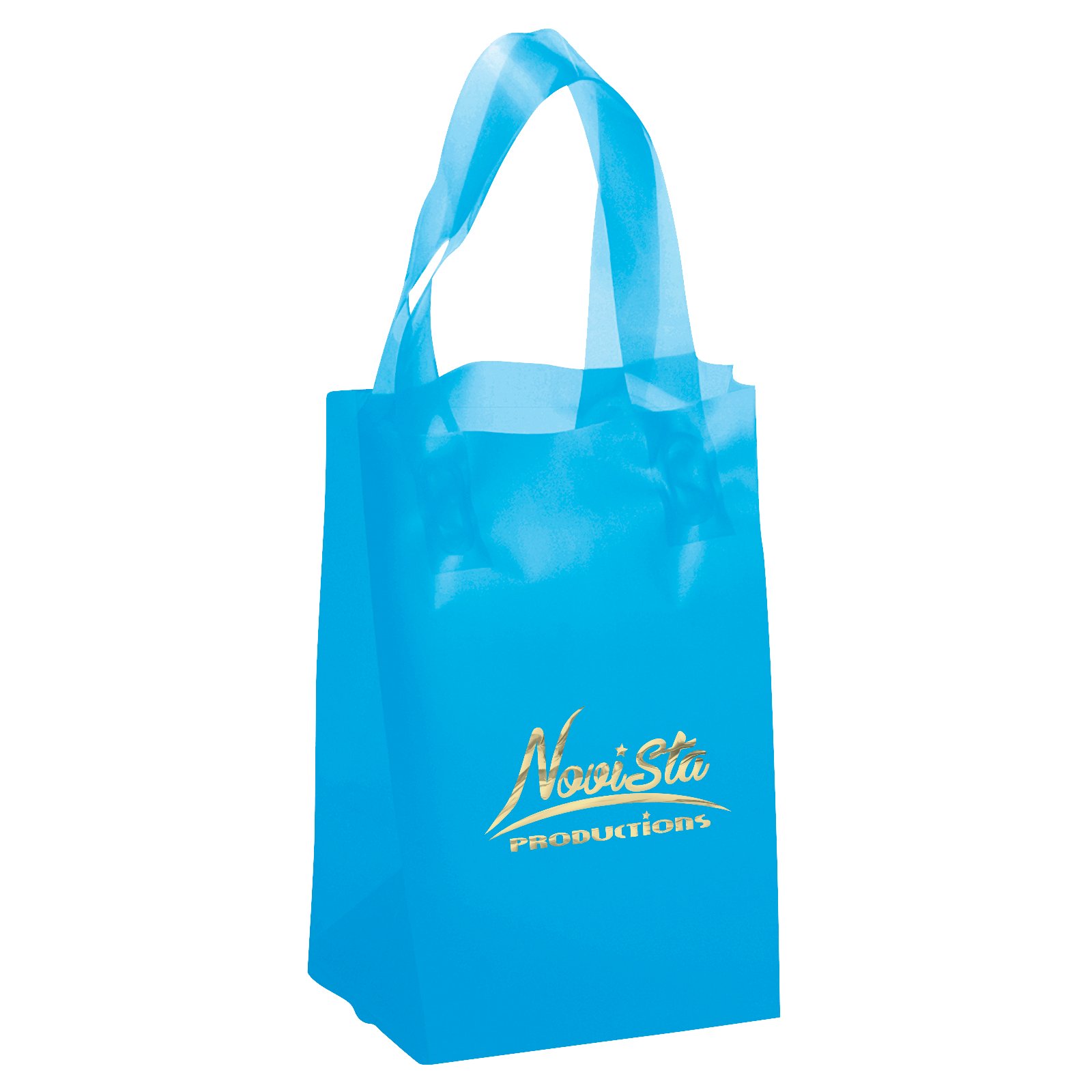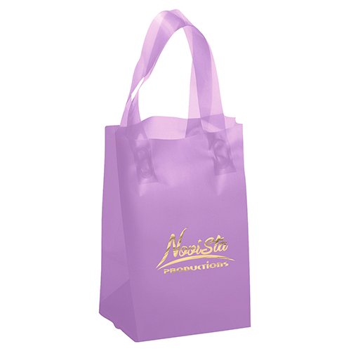 Colorful frosted hi-density plastic bag features fused loop handles and a cardboard bottom insert. Complies with CPSIA, C-TPAT, FDA, Prop 65. 5″ W x 3″ D x 8″ H