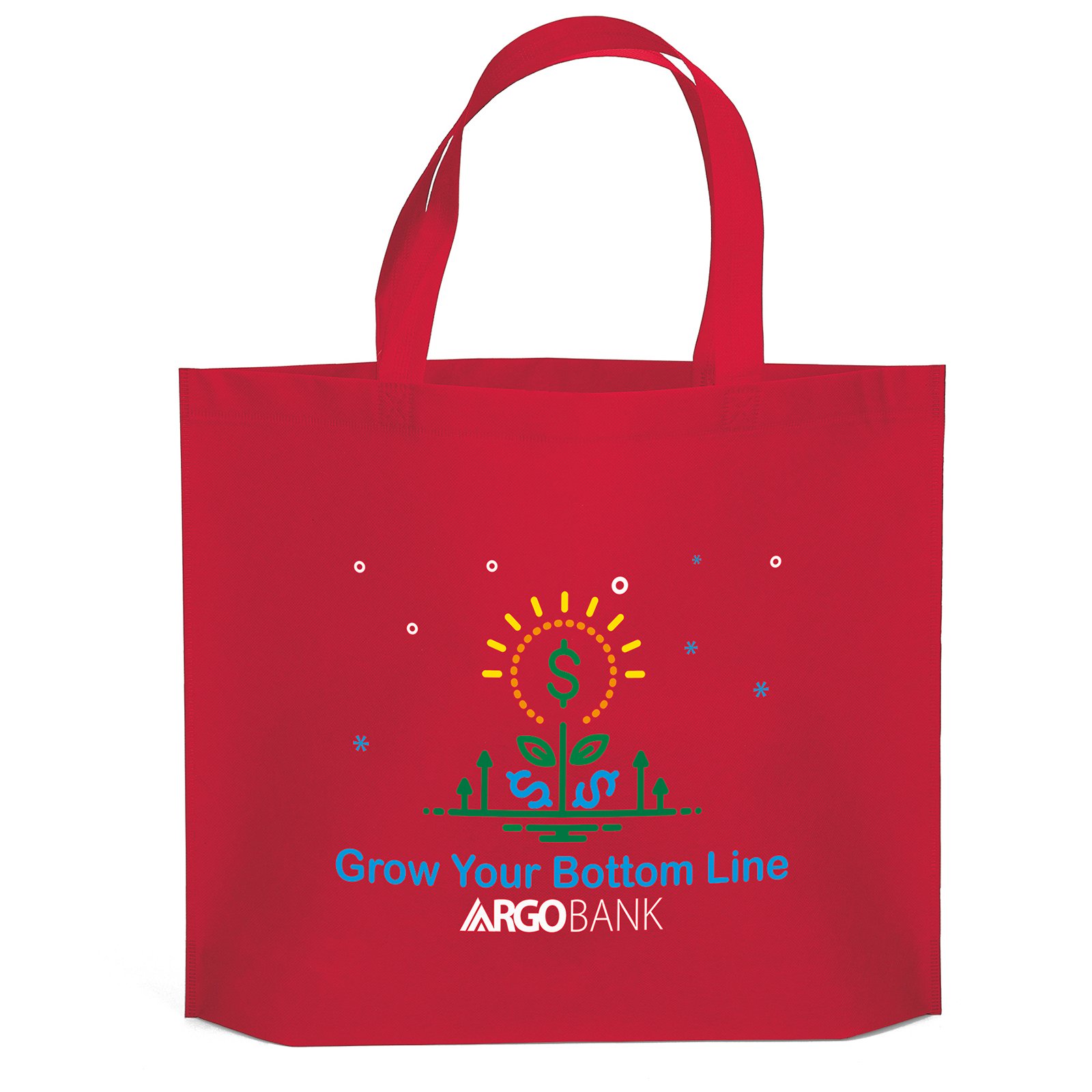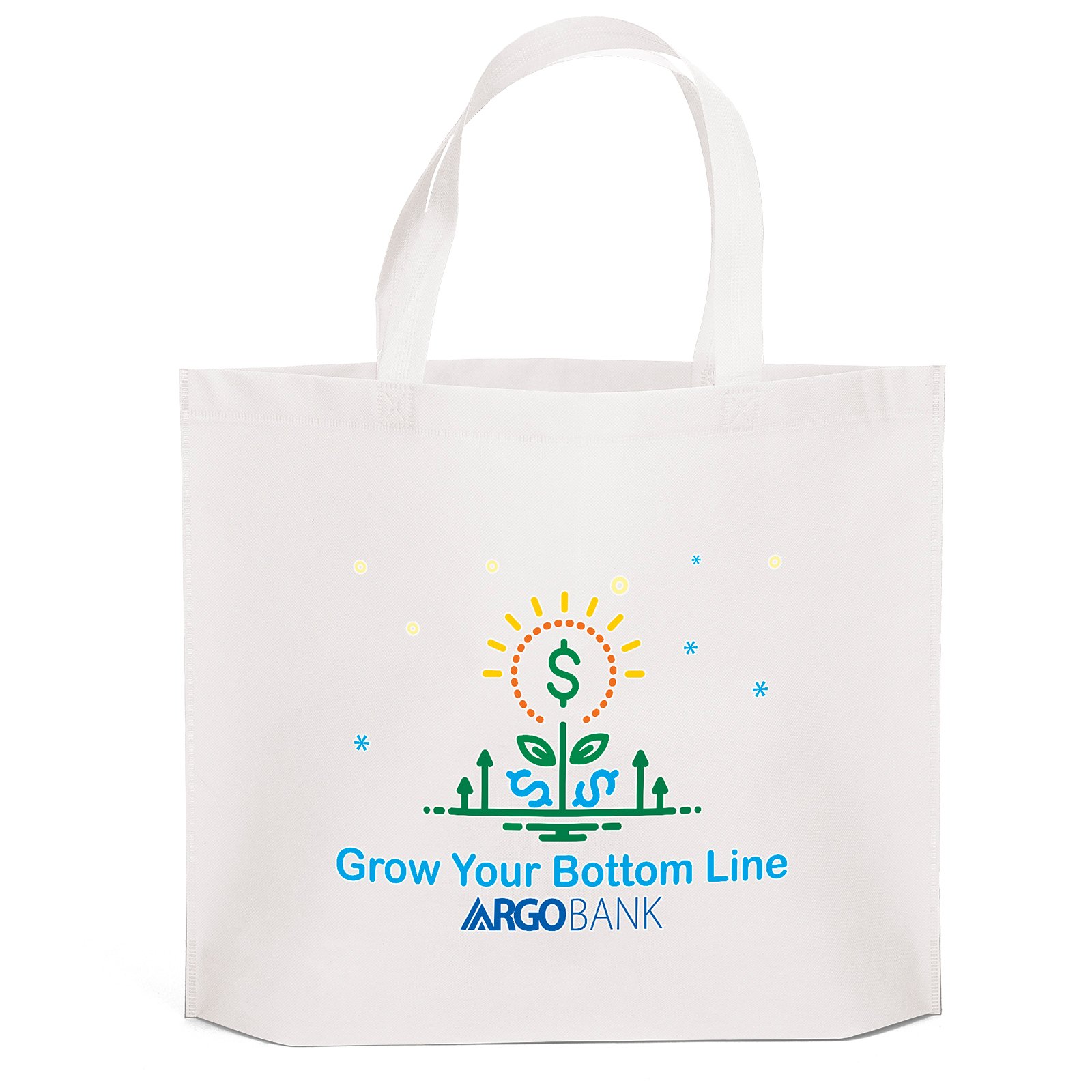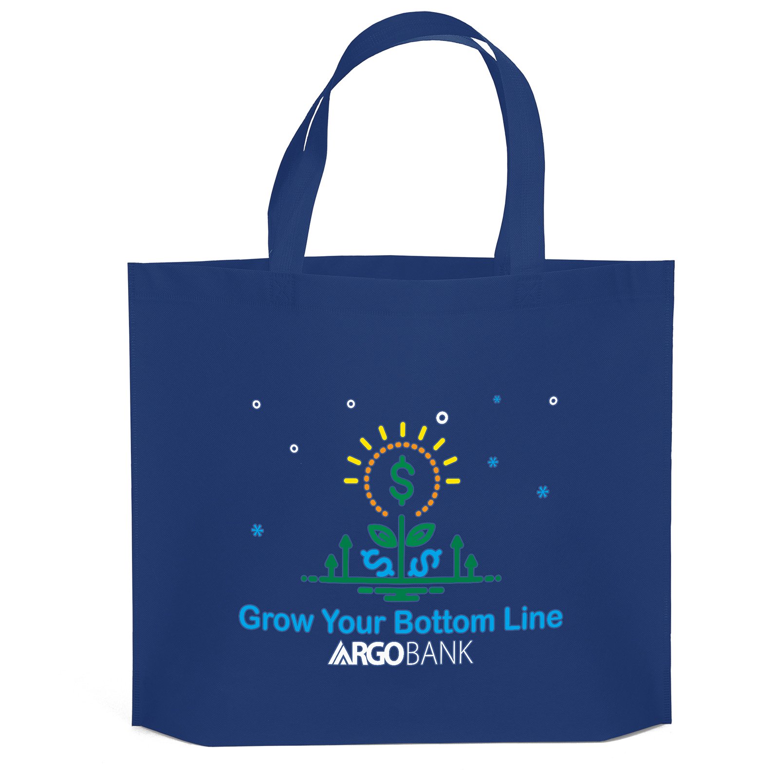 The affordable Thrifty™ Budget Tote is made with 80 GSM non-woven material and features heat-sealed handles. An optional plastic bottom insert is available for purchase. Handles measure 1 1/8″W x 19″ long. 19″ W x 15″ H x 4″ D