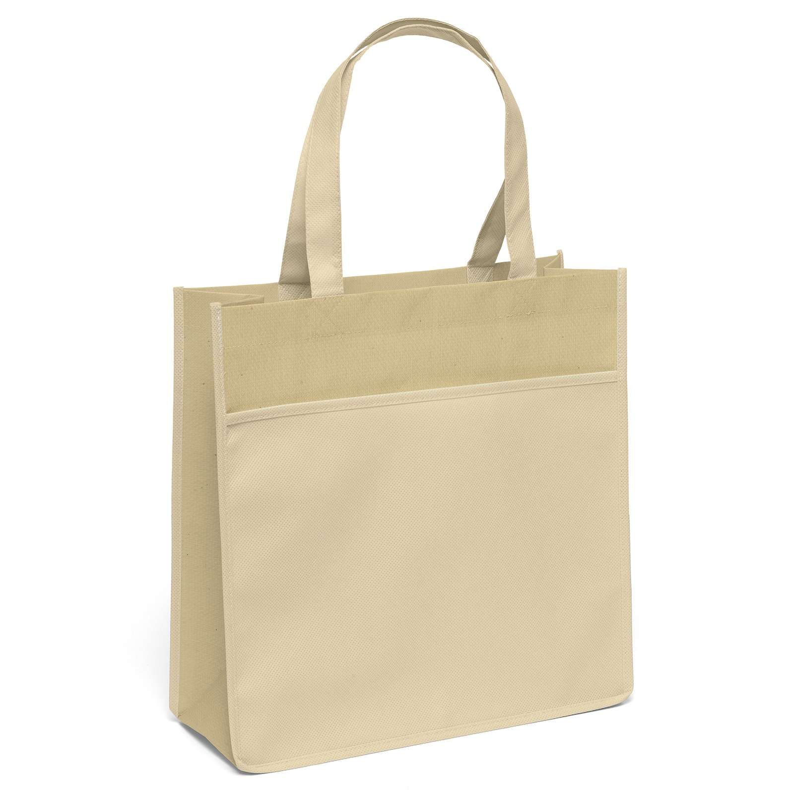 The 105-combined-GSM Urban™ Matte-Laminated Tote provides a subtle canvas look with a large, semi-transparent non-woven front pocket. An optional plastic bottom insert is available for purchase. Handles measure 1″W x 18″ long. 13″ W x 5″ D x 13″ H