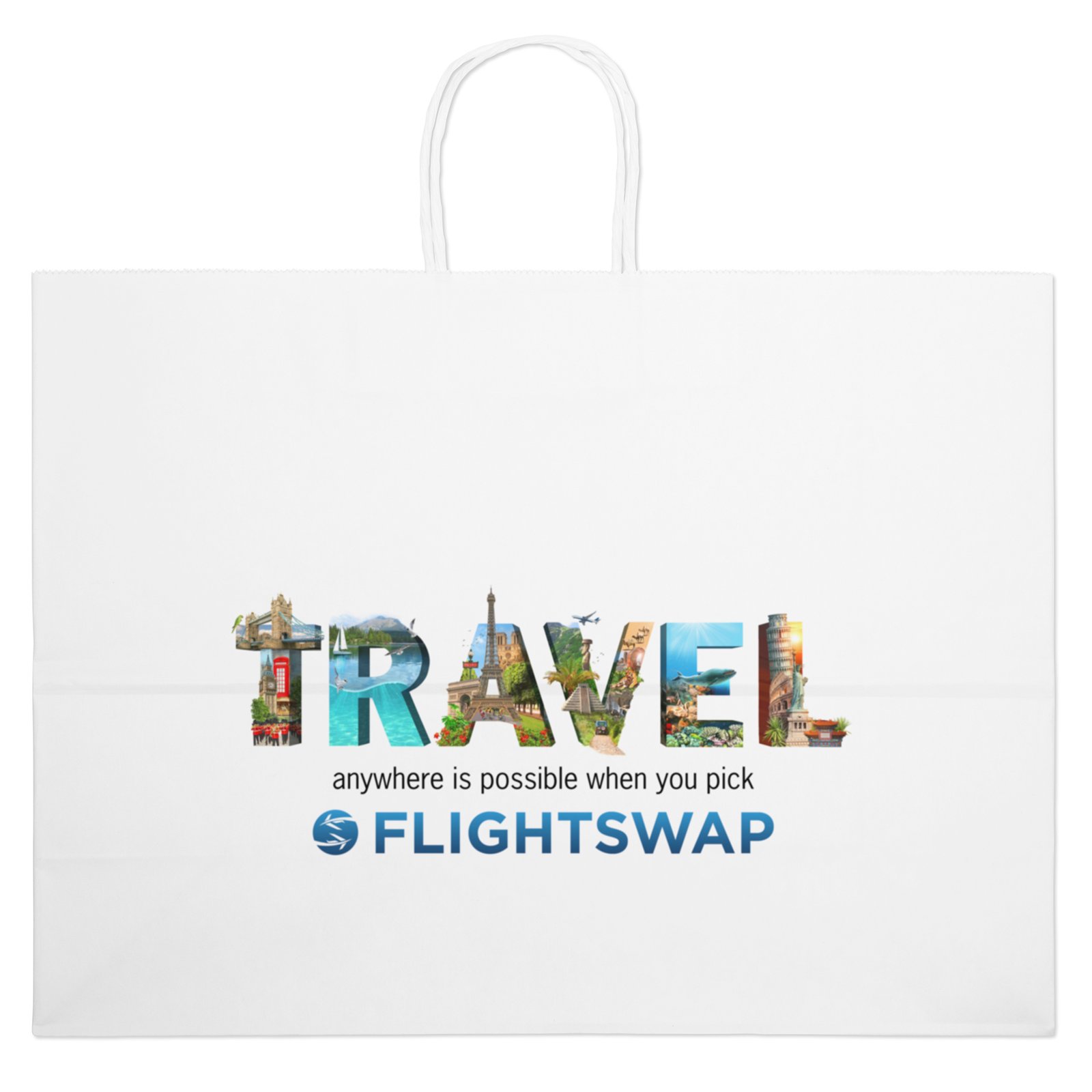 The Vogue White Shopper is made with white kraft paper and features twisted paper handles and a serrated cut top. 16″ W x 6″ D x 12″ H