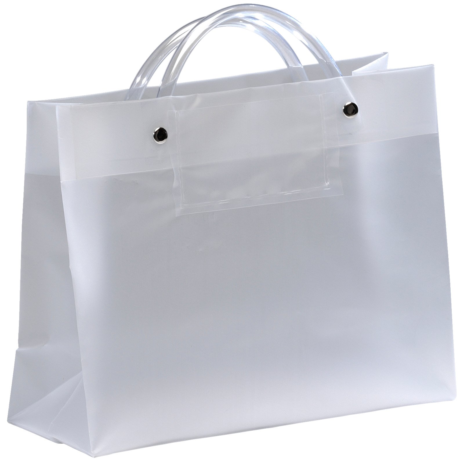 Frosted hi-density plastic bag features a clear pocket for a business card, gift card, or appointment reminder. The VP™ Executote features riveted comfort-grip clear plastic handles, a reinforced fold-over top, and a cardboard bottom insert. 10″ W x 4″ D x 8″ H
